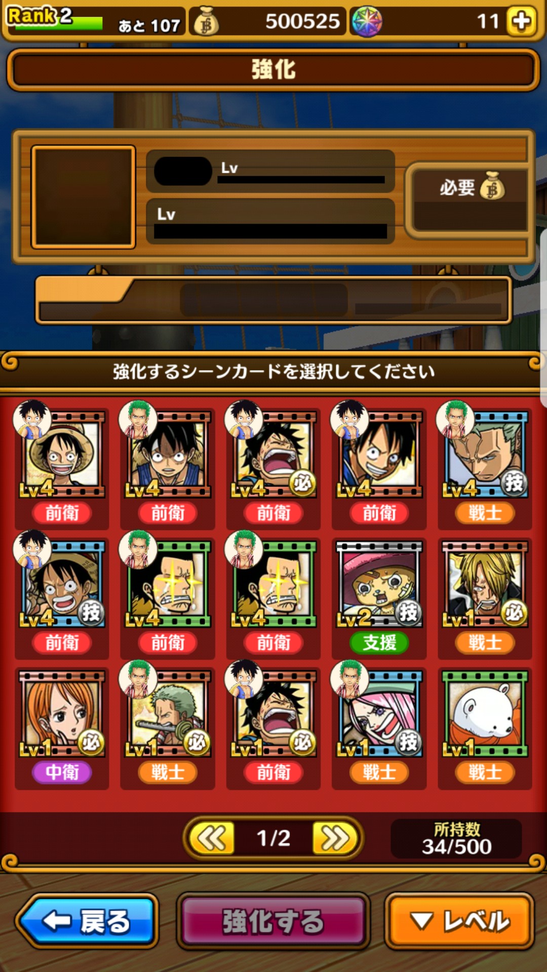 「キャラ」は獲得したてはレア度が1と低く装備できるシーンカードの数も少ないです。