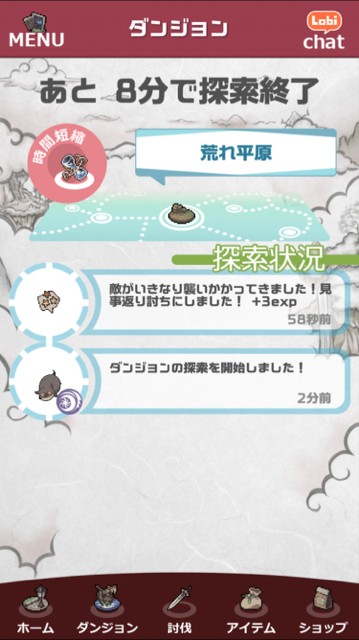 討伐では、レベルアップに必要な経験値が多くもらえて、ダンジョン探索ではアイテムを拾ってきます。