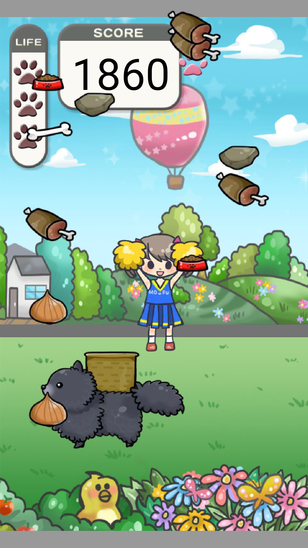 黒いポメラニアンの「もふ」を左右に動かして、落ちてくるアイテムを背中のカゴでキャッチしていく落ちゲーです。