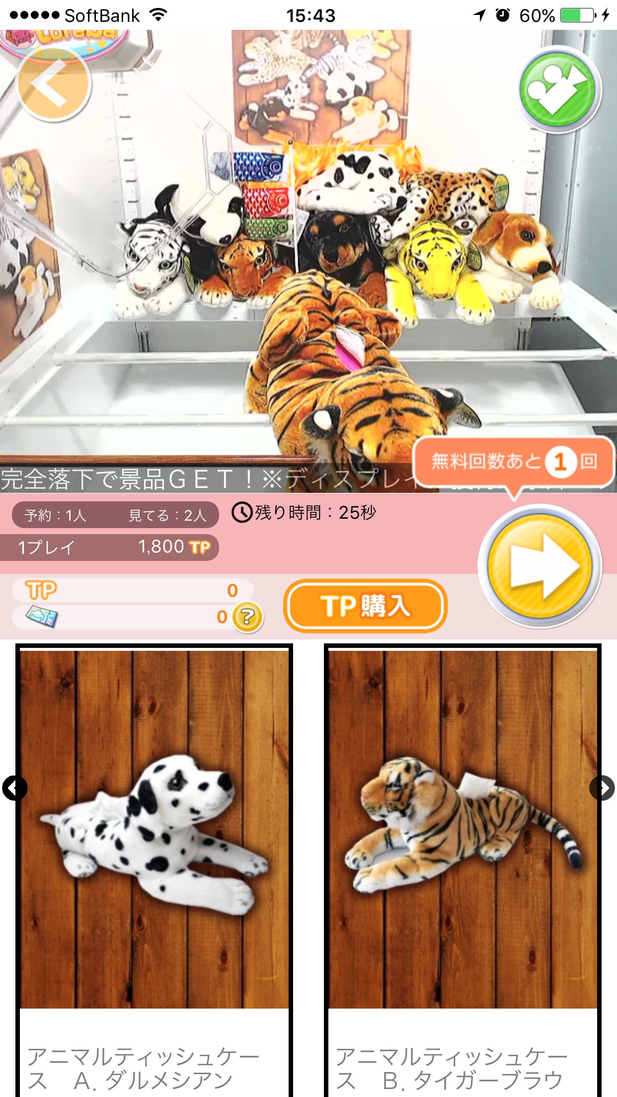 クレーンゲーム画面が現れ、「この台をプレイ」ボタンを押すことで台を予約します。