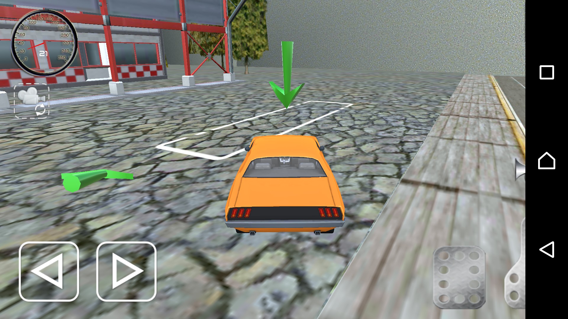 左右の操作やアクセルの操作などを試行錯誤しながらなんとか矢印の方へ走らせると、今度は下を向いた緑の矢印発見。どうやらそこへ行けばミッションクリアということなのでしょう。そして無事にたどり着くと、タイムが表示され、お金がもらえます。タイムは特に記録されるわけではないので、自己ベストを出していたとしても分かりません。自分で覚えておくよりないようです。