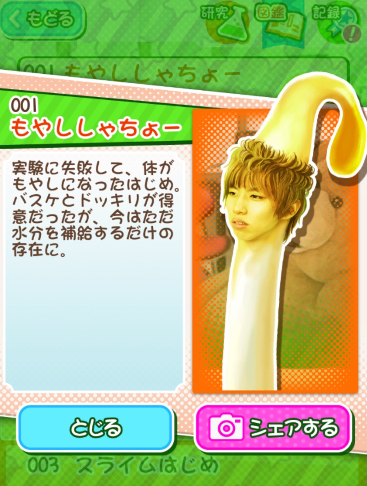 発見した新種のもやししゃちょーの情報は、図鑑として見ることができます。種類もそこそこありそうなので、集め甲斐がありそうです。それぞれにコメントもついているのでファンには頷けることが書かれているかもしれませんね。