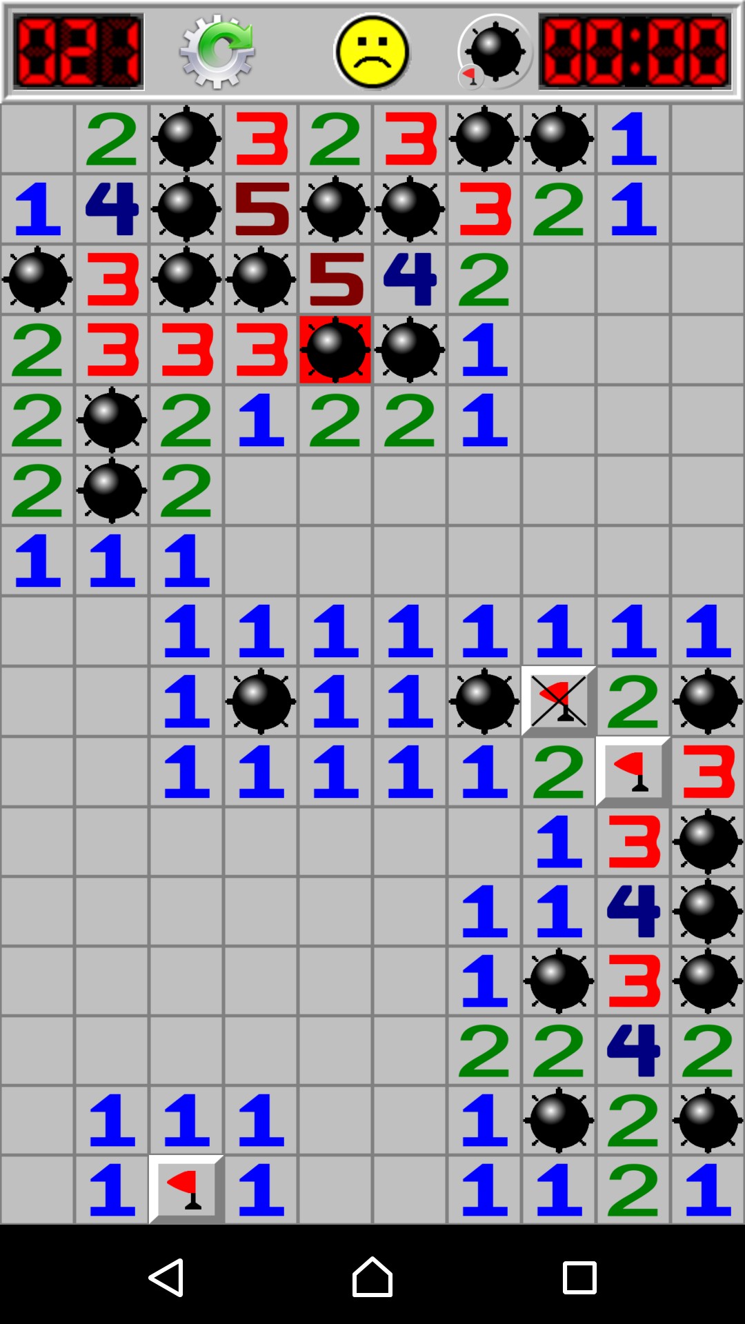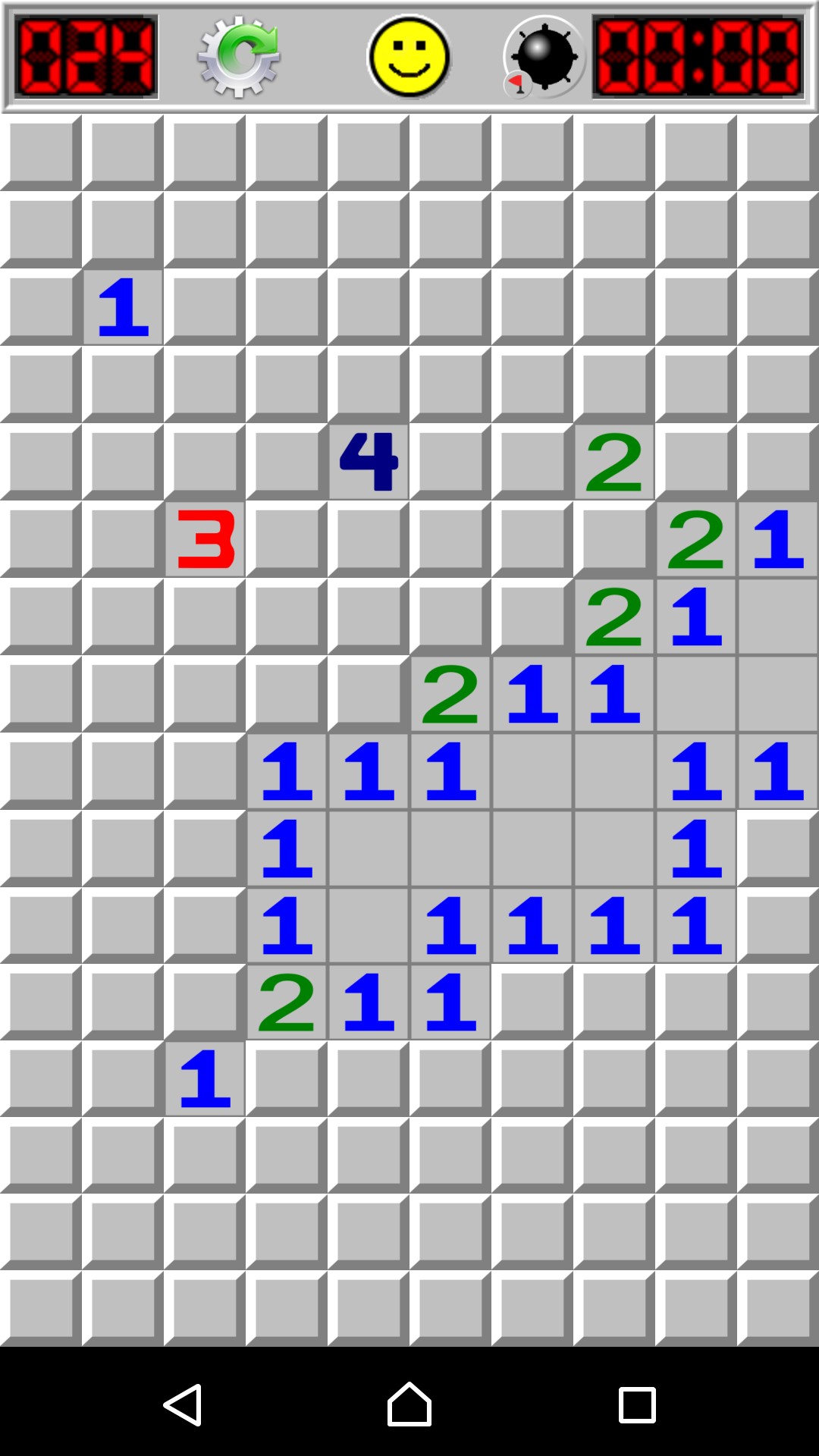 あいにく地雷を踏んでゲームオーバーになってしまったら、上部中央の黄色い顔をタップするとまた始めることができます。