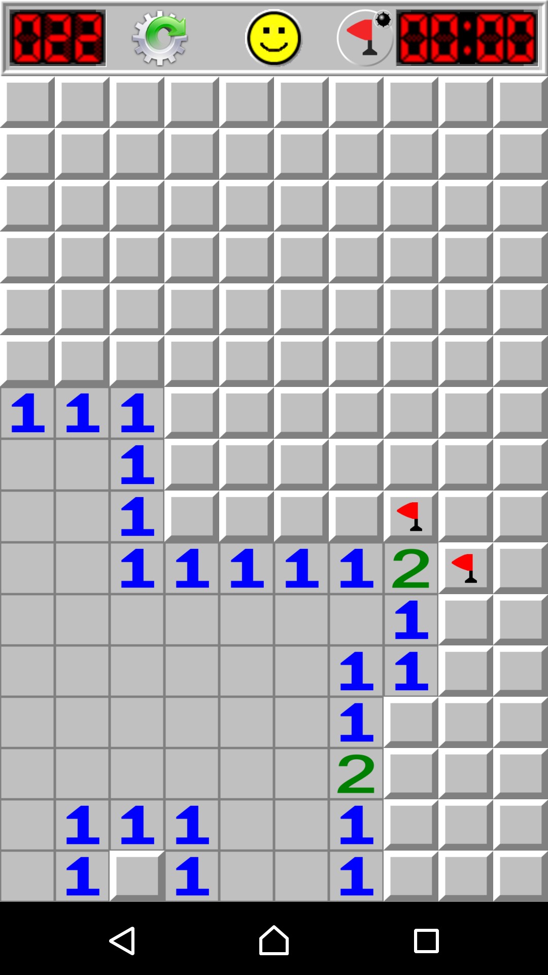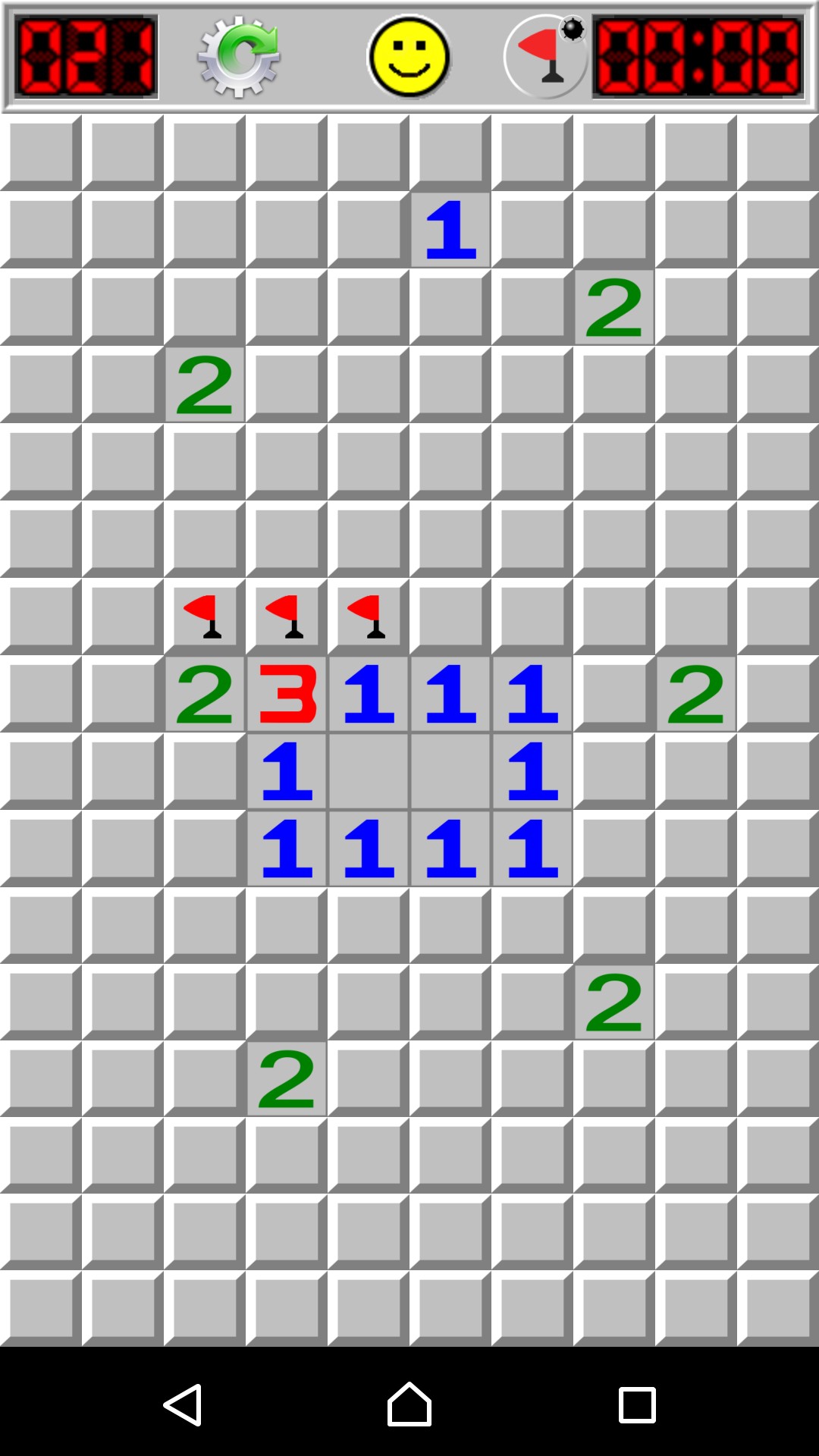 このようにして少しずつ地雷のないパネルを開いていくのですが、途中でどこが地雷と推測したのか分からなくなることがあります。その問題を回避するために、「旗」を活用してください。「旗」は、地雷が埋まっていると疑わしいパネルに設置しておいて、目印とするものです。旗を置いても地雷は作動しません。右上の爆弾ボタンをタップすると旗を立てるモードに切り替えることができるようになります。もう一度タップするとパネルをタップする地雷探索モードに戻ります。旗と間違えて地雷探索モードのまま怪しいところをタップしないように気をつけてください。なお、旗を消したい場合は、旗モードにして目的の旗をタップすると消すことができます。また、旗が立っている状態では、地雷探索モードにしてタップしてもパネルを開くことはできません。開くには旗を取り除く必要があります。