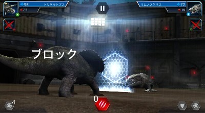 青色のボタンをタップすると、恐竜に「防御」の指示を与えます。攻撃ダメージを受けず、相手の恐竜の攻撃をブロックできることもあります!
