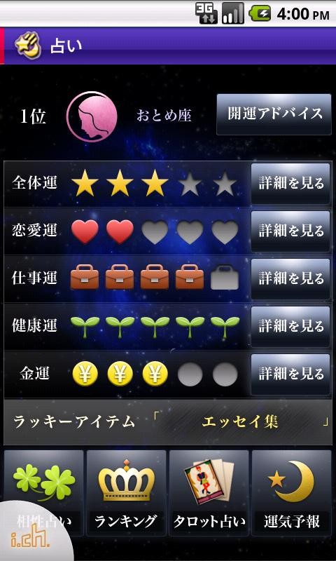 信じていても信じてなくてもつい覗いてしまう毎日の占いは星座占いが用意されています。全体運や恋愛運がマークの数で表示されるので、忙しい時でもひと目で確認できます。もちろん12星座ランキング、相性占い、星座ごとのラッキーポイントなどの詳細も調べられて、12位の星座向けの開運アドバイスもあります。