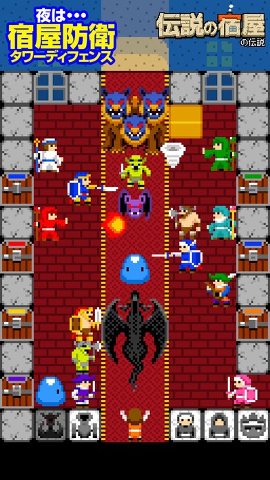 戦闘パートでは泊まってくれた勇者たちにお金を渡して、宿屋を守ってもらいます。各部屋の前に配置して、襲い掛かってくる魔物たちを退治しましょう。また一定時間で勇者たちとは別の傭兵を配置することもできます。