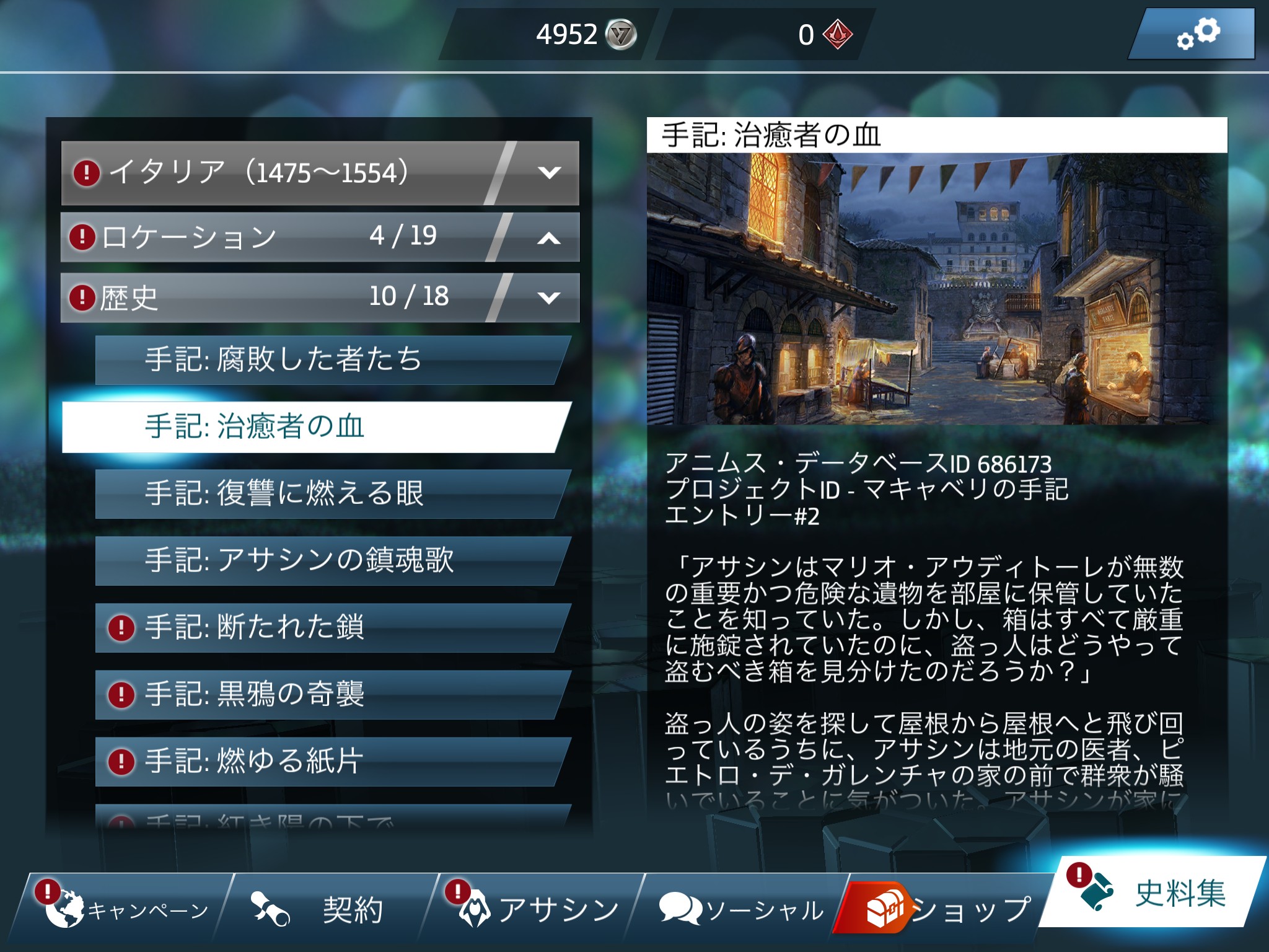 調べるとシリーズ作品は結構あります。幾度となく繰り広げられるアサシン教団とテンプル騎士団の戦いをいろんな作品で楽しんでみたいものです。ひとまずはPS4でロンドンの戦いを、アプリでイタリアの戦いを楽しんでいこうと思います。