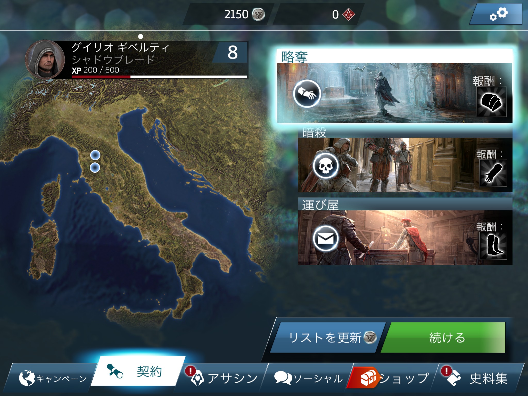 暗殺、略奪などランダムでミッションが出てきます。自分はキャンペーンを進めながら、合間に契約でレベル上げをしていきました。レベルが上がっていくと、いろいろなものが解放されていくのでより有利にミッションをこなしていくことができます。
