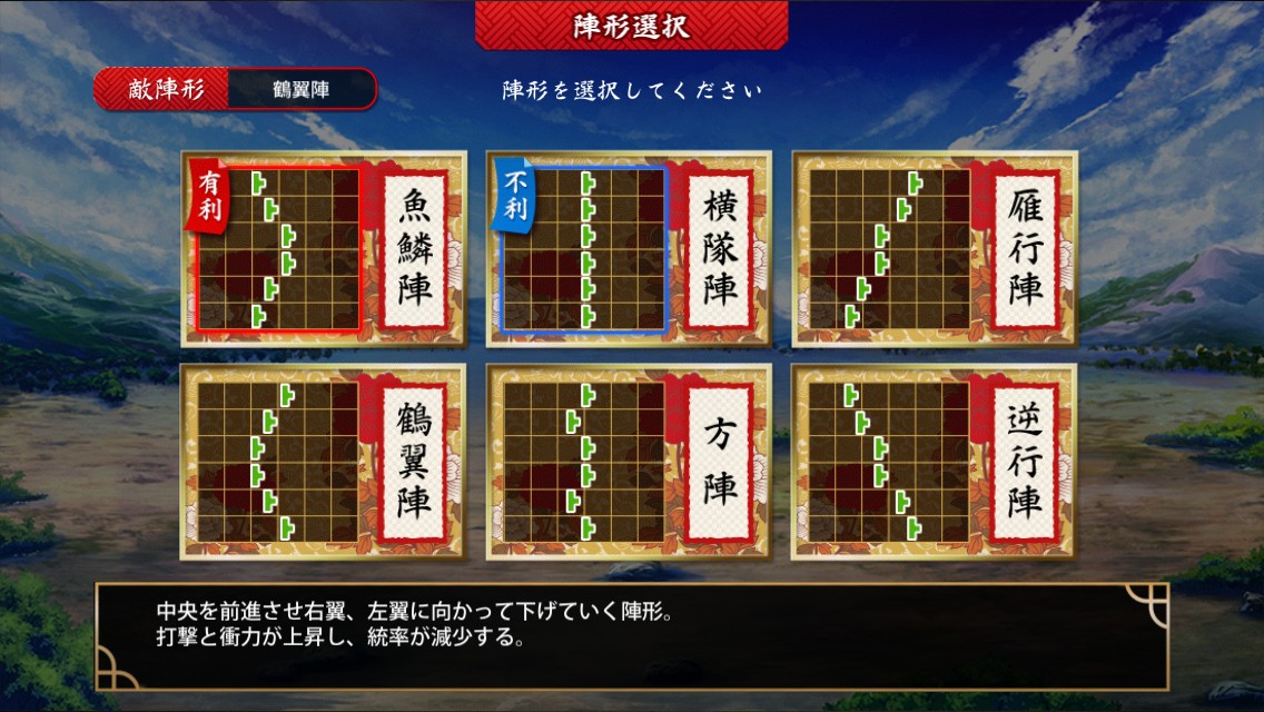 索敵が成功し、相手の陣形が明らかな場合は、相手に有利な陣形を選択することが出来ます。
