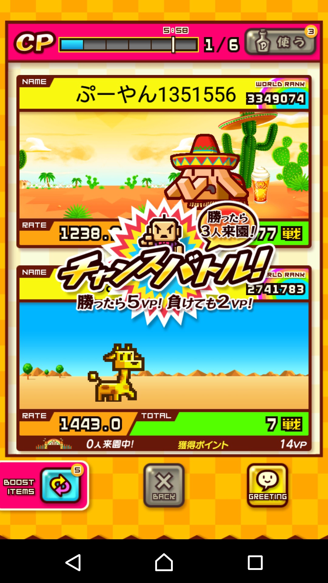 対戦を3回すると、「マイ動物園」が開放されます。ここでは動物を展示し、お客さんを集めることができるのですが、まずは動物園レベル3にならないと何もできません。右下の「VS対戦!」からバトルして、レベルを上げていきましょう。