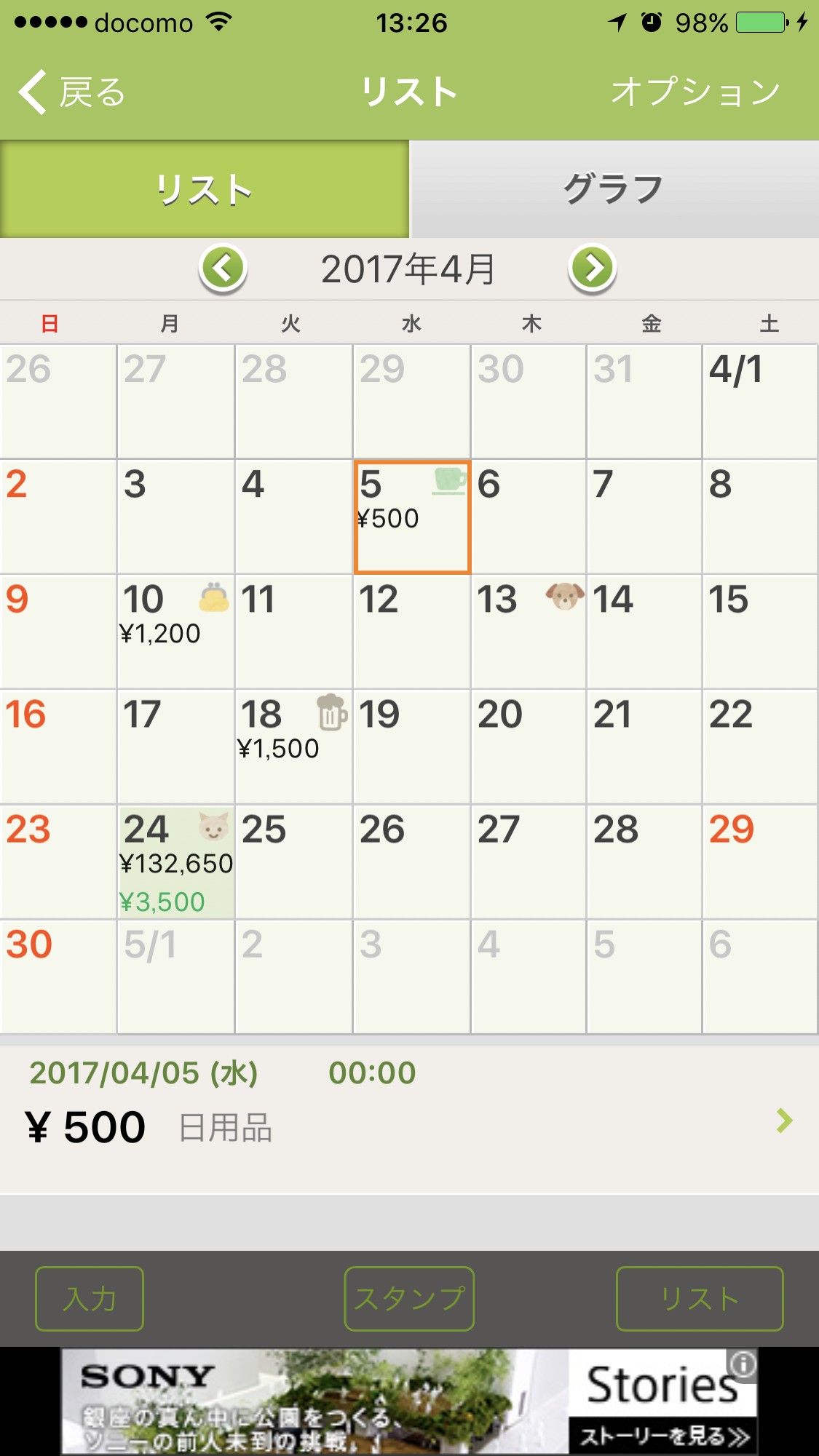 また、可愛いスタンプもあり、このスタンプを使って家計簿を見やすくする事ができます。さらに、ちょっとしたメモを合わせて入力することもできます