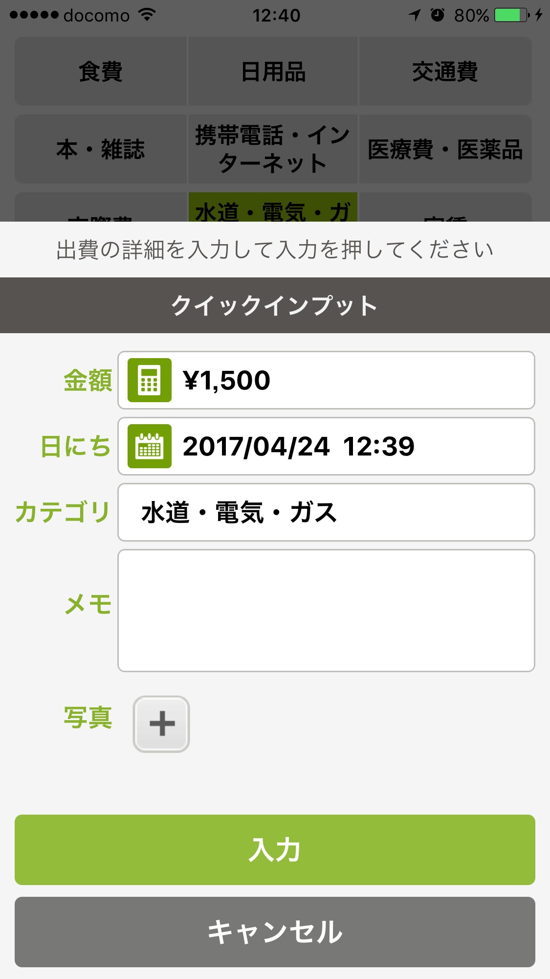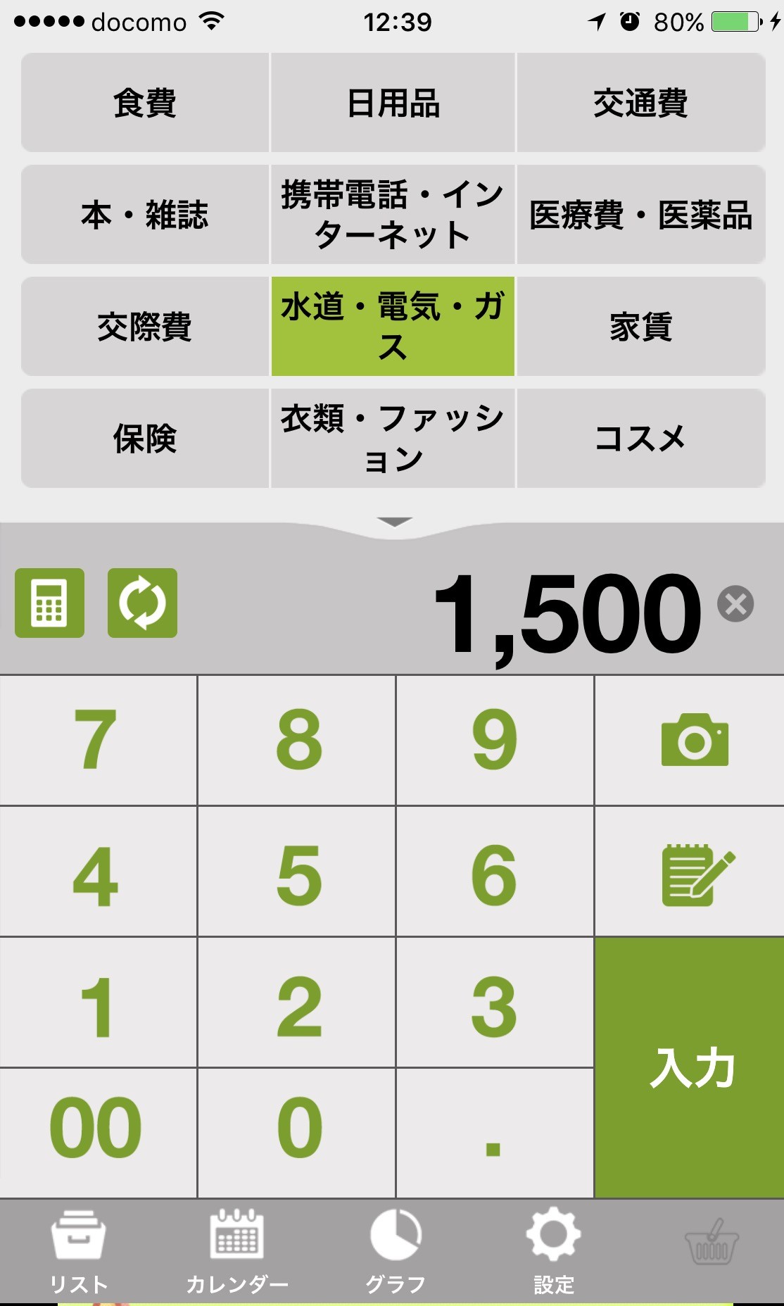 「食費」「日用品」「交通費」などのカテゴリは入力画面に表示されています。要らないカテゴリや追加したいカテゴリなどは編集することができるので、自分で使いやすいように編集するのがオススメです。