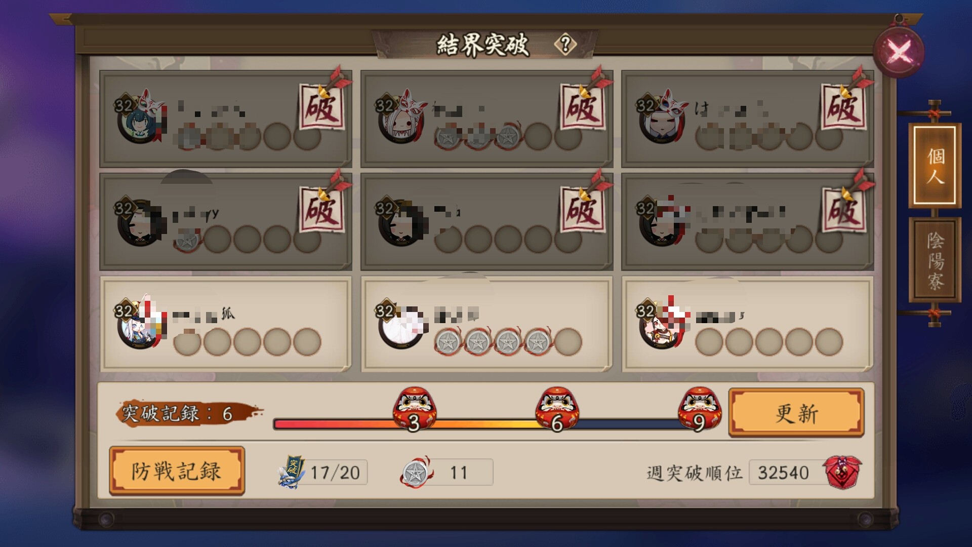 ランダムで表示される他のプレイヤー9人の中から、どれかを選択して結界突破券を消費して戦うことが出来るモードです。