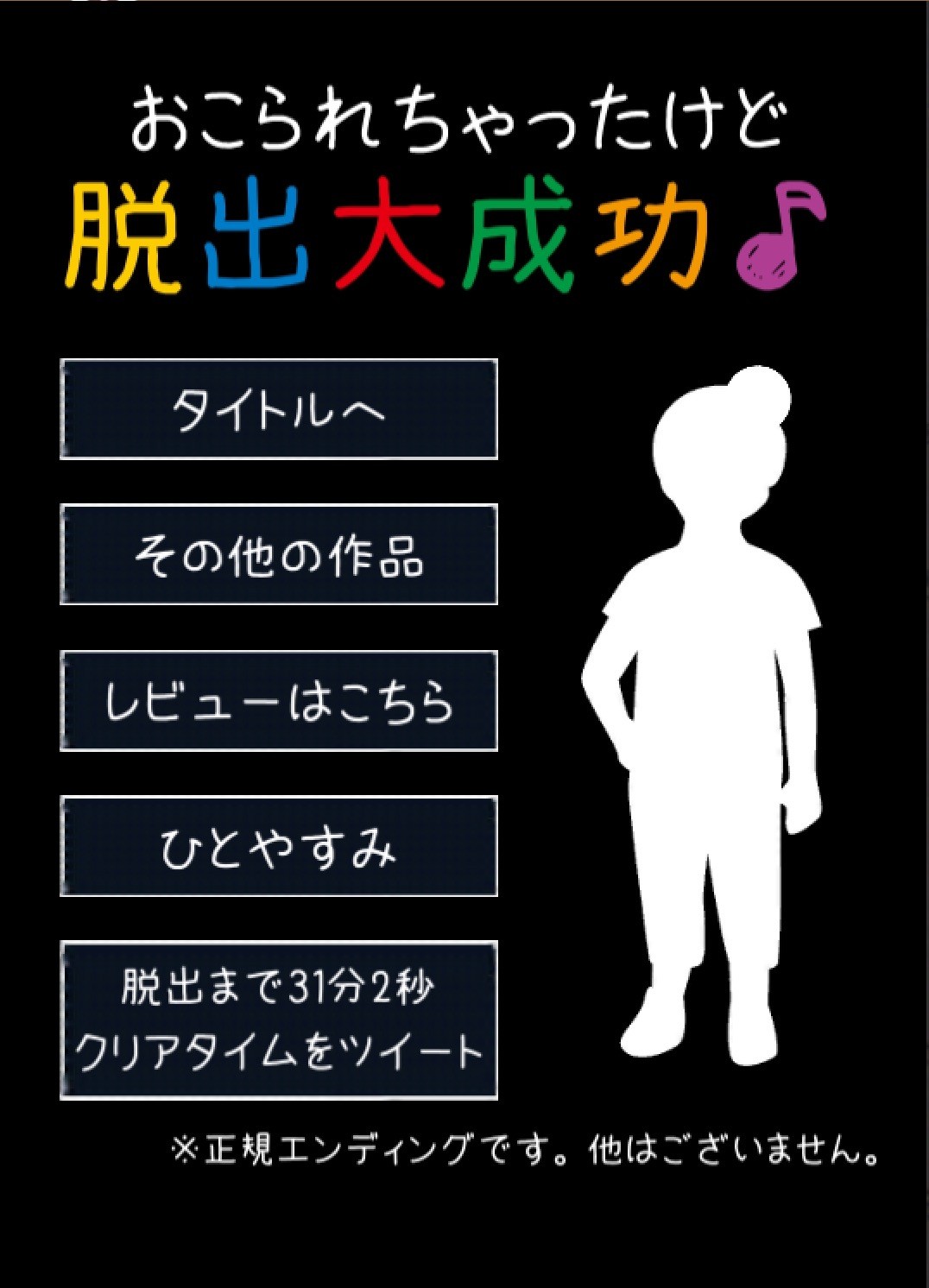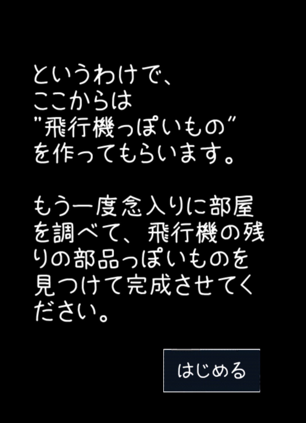 無事に飛行機っぽいものを完成させると、お父さんの部屋から脱出できます。あとはストーリーを見てゲームクリアです。