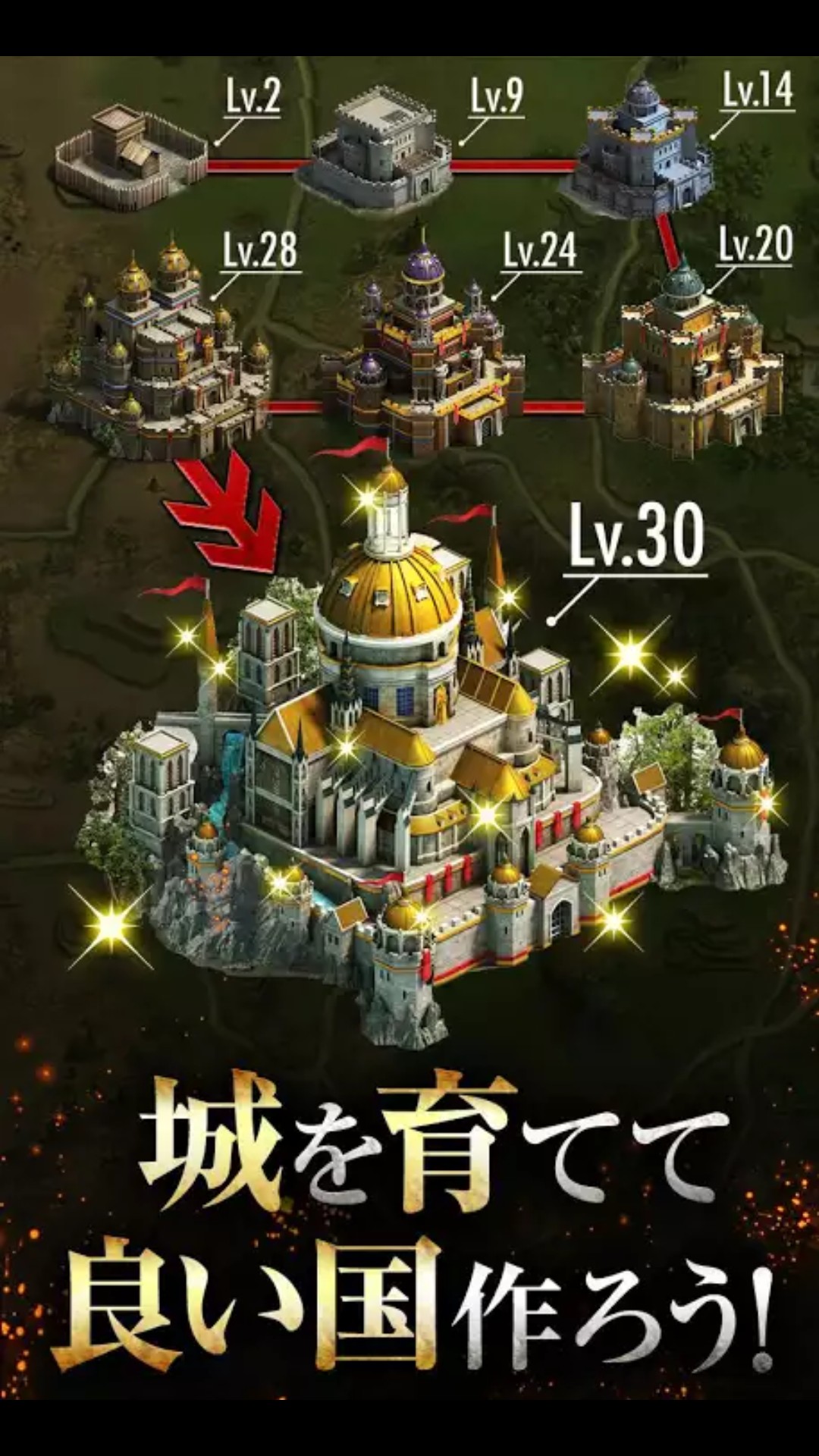 城や兵士たちを育成する国づくりと、軍を率いてリアルタイムで戦う戦略バトルの両方が楽しめるアプリとなっています。