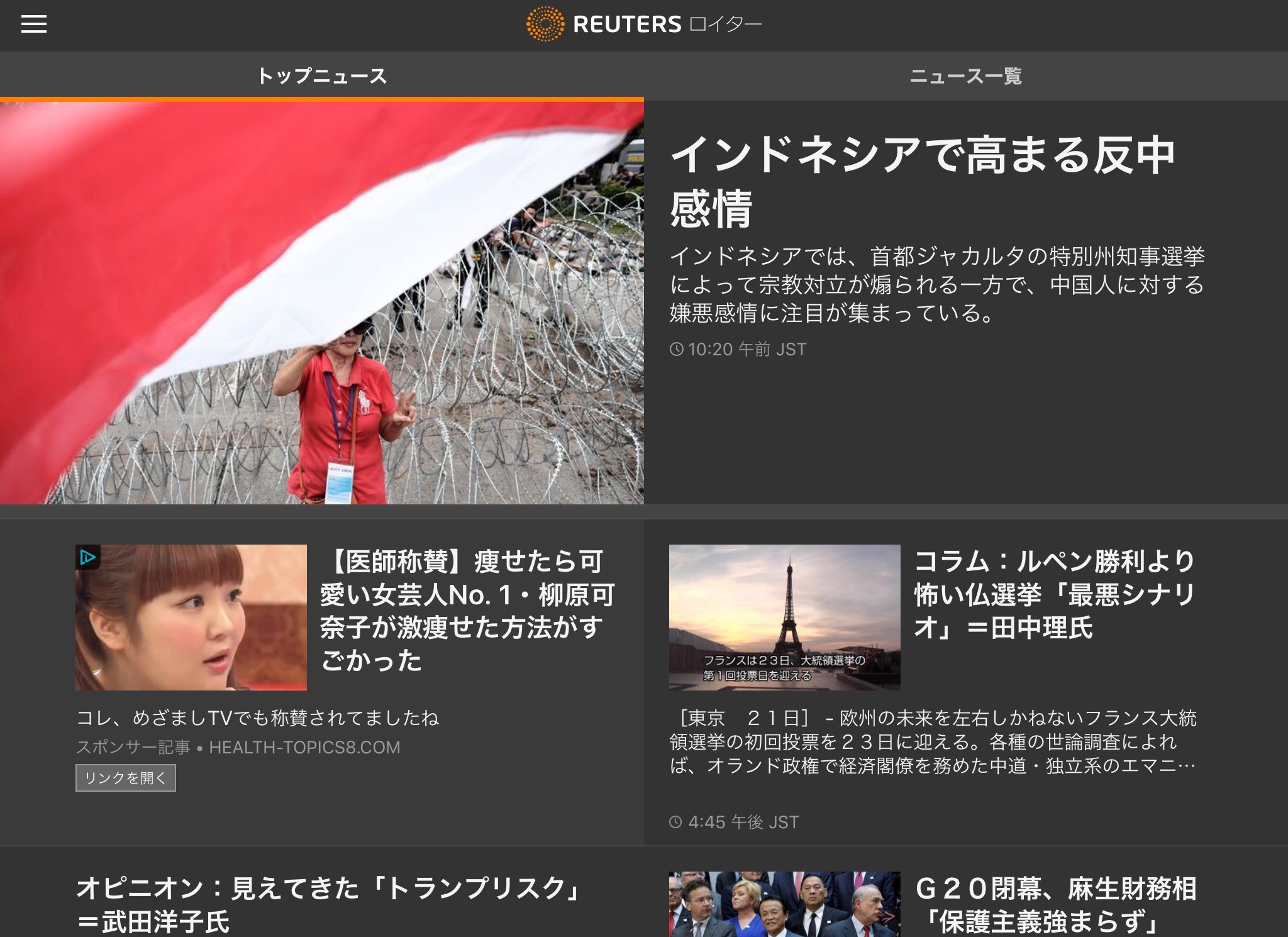 ロイター通信は国際的通信社ということもあり、日本語以外にも英語、中国語など、言語を変えて読むことが可能になっています。