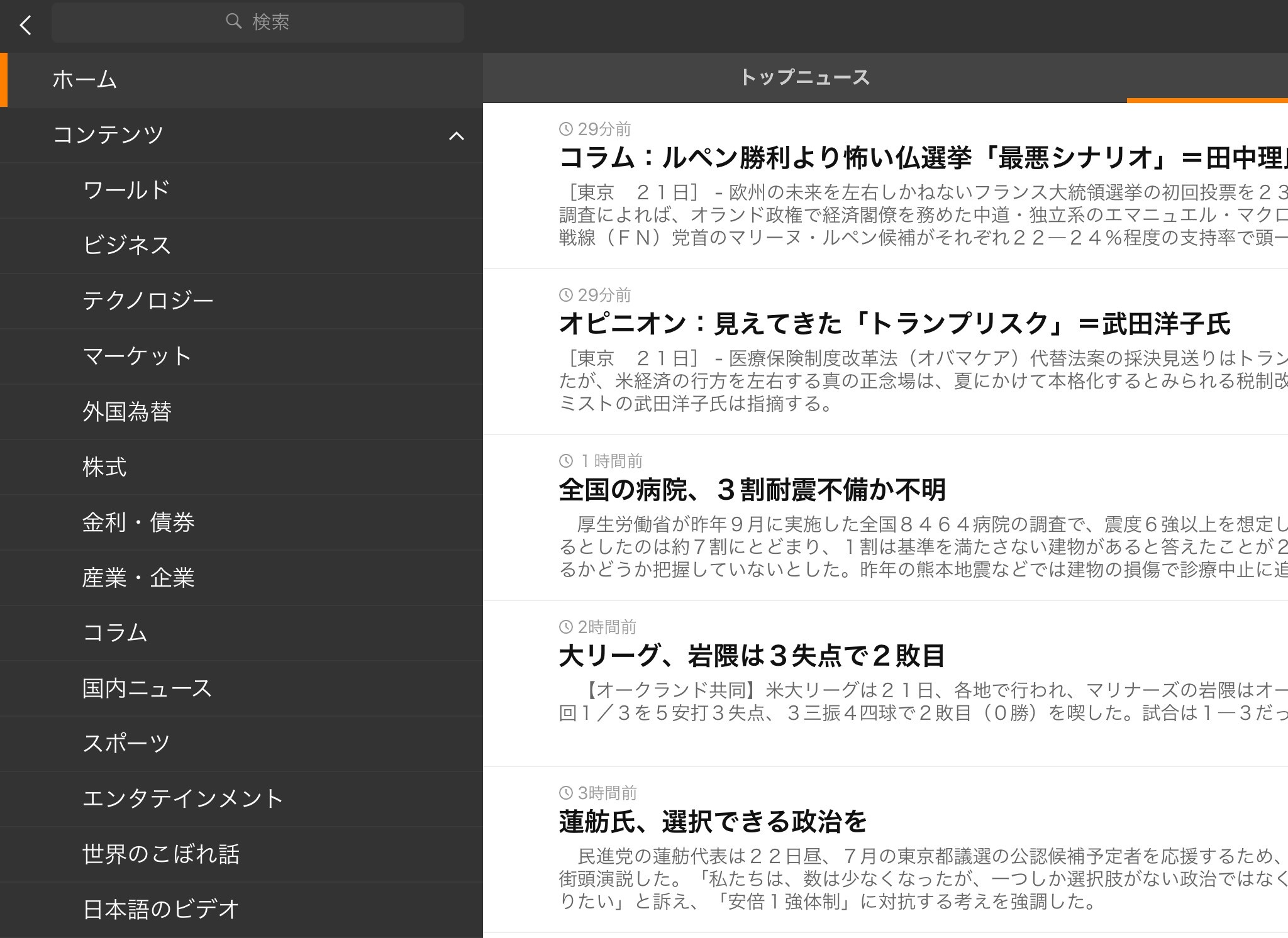 メニューボタンでカテゴリーを選べば、(ワールド・ビジネス・テクノロジー 等)ジャンルごとに国際ニュースを見ることが可能です。国内ニュースはもちろん、多数の国外の情報もまとめて探せるので、世界情勢を知りたい人にとって「ロイター」はトップクラスで活用できるニュースアプリになっています。