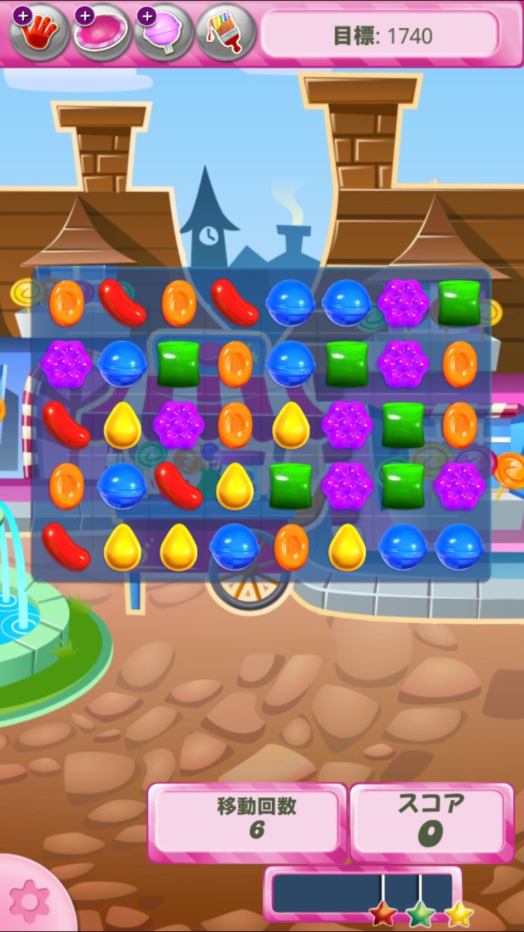 このキャンディークラッシュというアプリゲームは下の画像のような盤面に出ているキャンディーを1つ動かし、消すことでスコアを上げるゲームです。