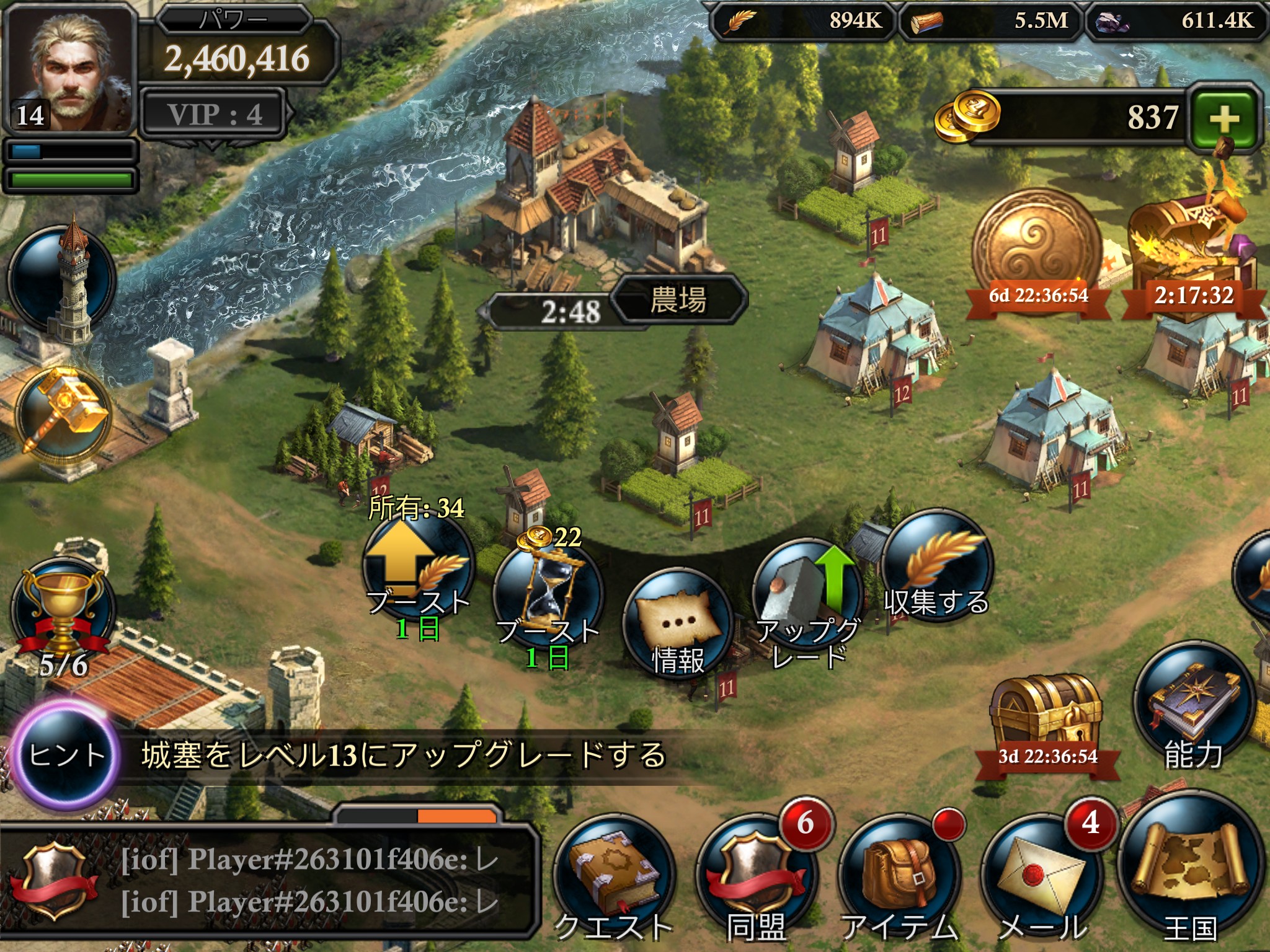 自分がやってみている感じでいうと、製材所と農場を優先的にアップグレードしていくのが良いかと思います。なぜなら、施設のアップグレードにしても、兵力を増やすのにも、何をするのにも基本的に木材と食料が必要になるからです。それを採取できるのが、製材所と農場なのです。