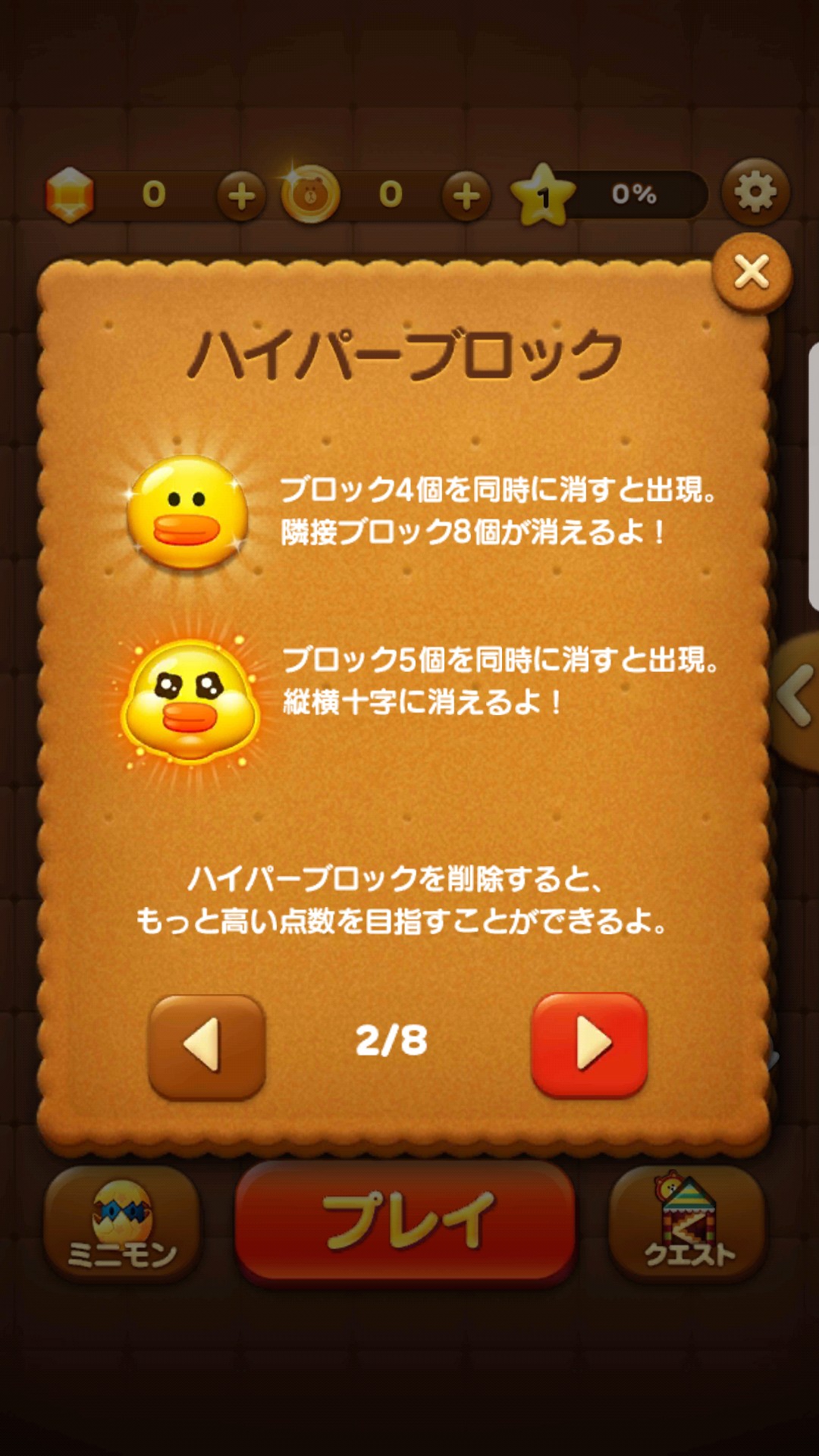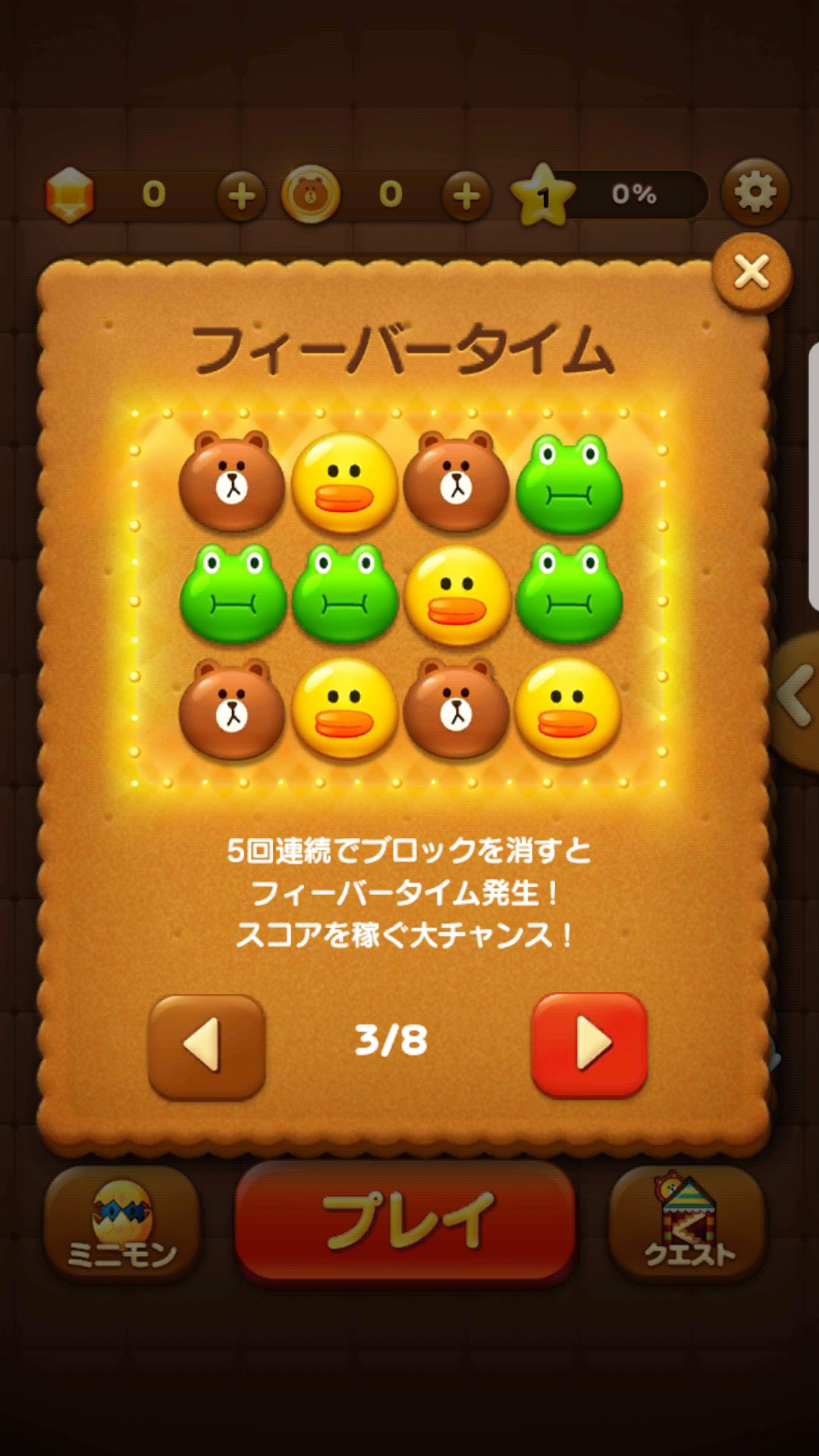 右の画像のように、LINEキャラのブロックを同じ形で3個以上並べて消していこう!