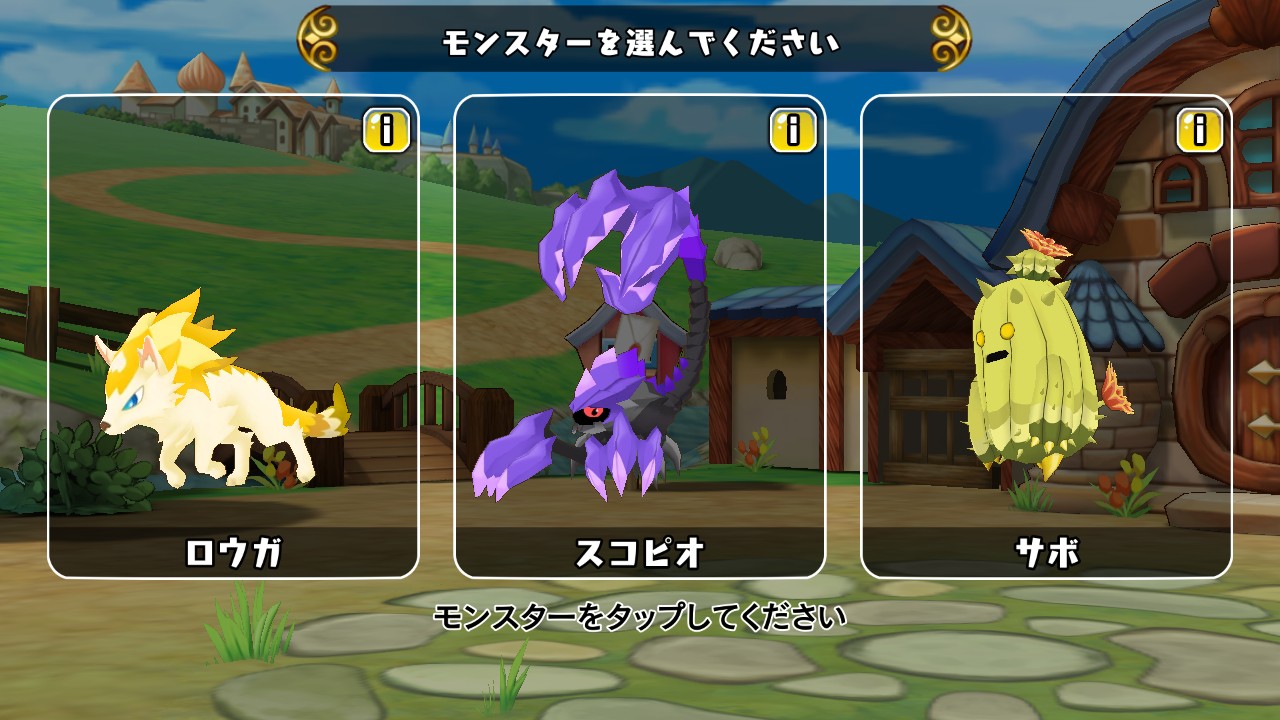 新人ブリーダーには「ロウガ」「スコピオ」「サポ」のモンスターの中から1体あたえられます。