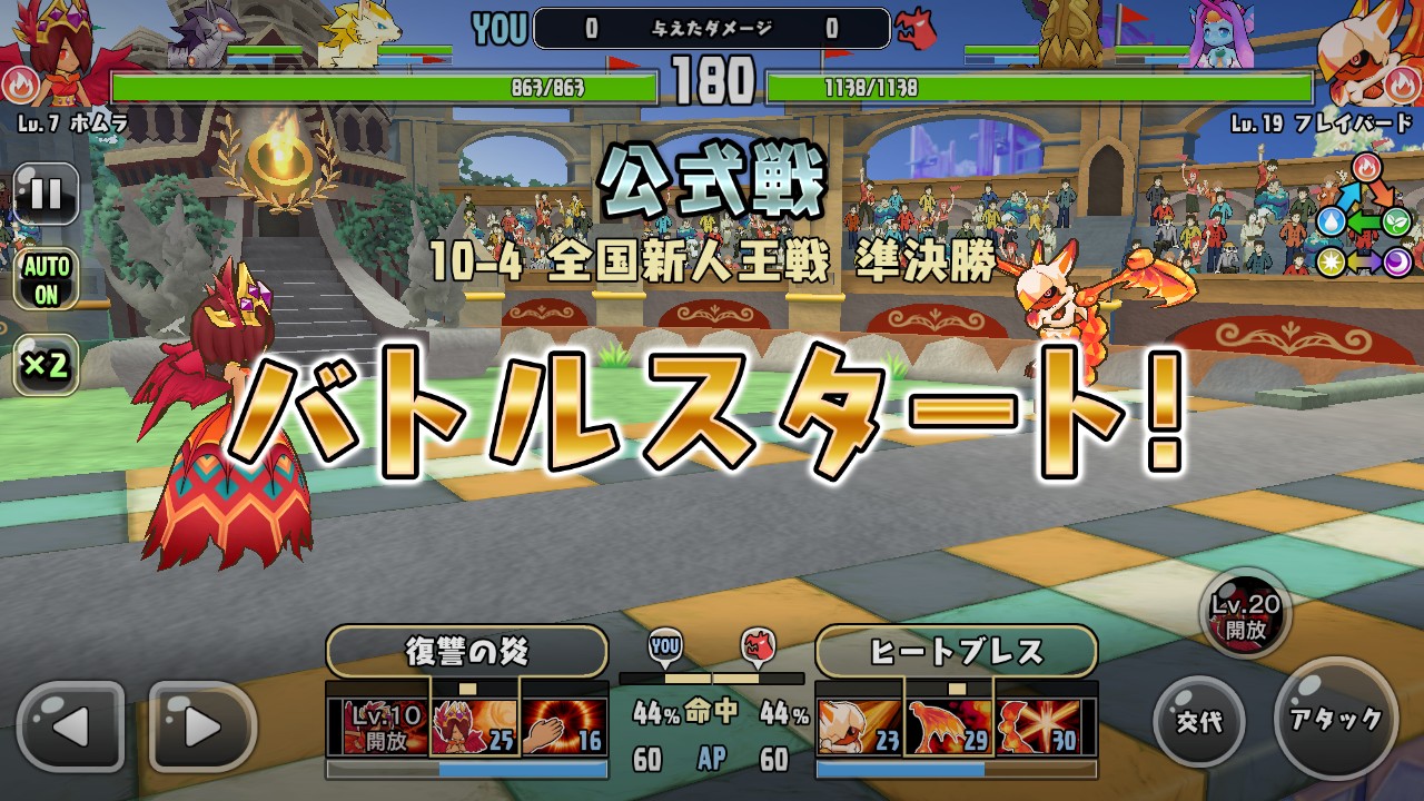 モンスターブリーダーの3Dバトルは、周回時間を短縮できる「2倍速」と「オートモード」を有効に使うとテンポよくすすめることが出来ます。