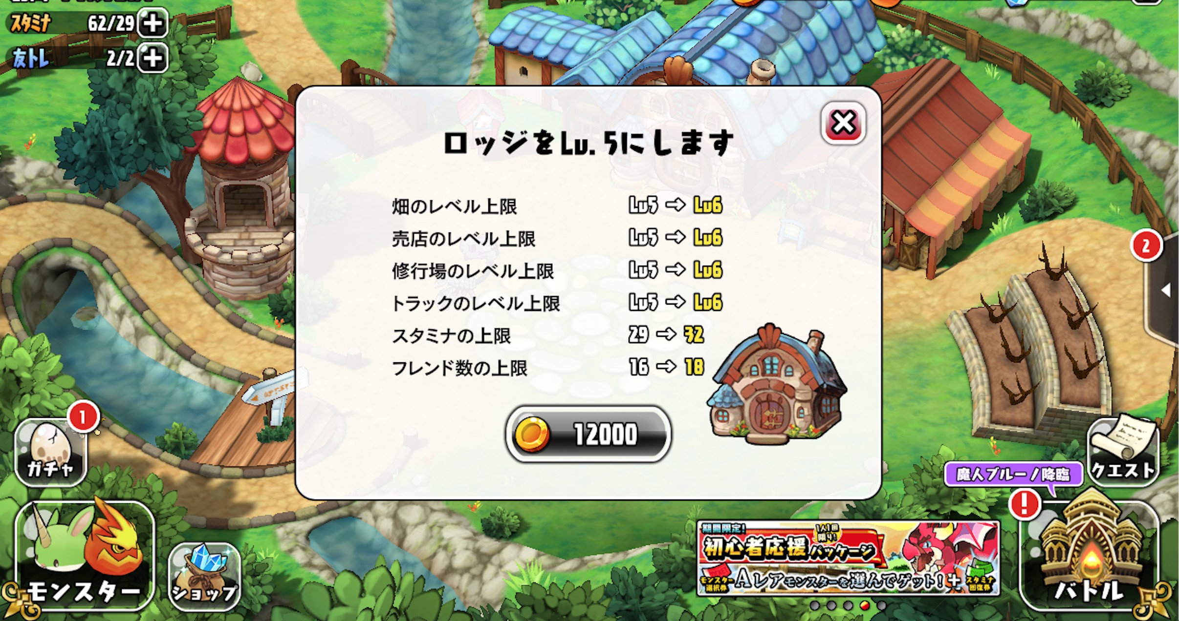 「ロッジ」を拡大すると、施設全体の「畑」「売店」「修行場」「トラック」「スタミナ」「フレンド」すべてのレベル上限が上がり「結晶石」も手に入れる事ができます。最初からスタミナの上限を上げておくと後々有利にすすめて行けるので、優先的に「ロッジ」のレベルは上げておきましょう。