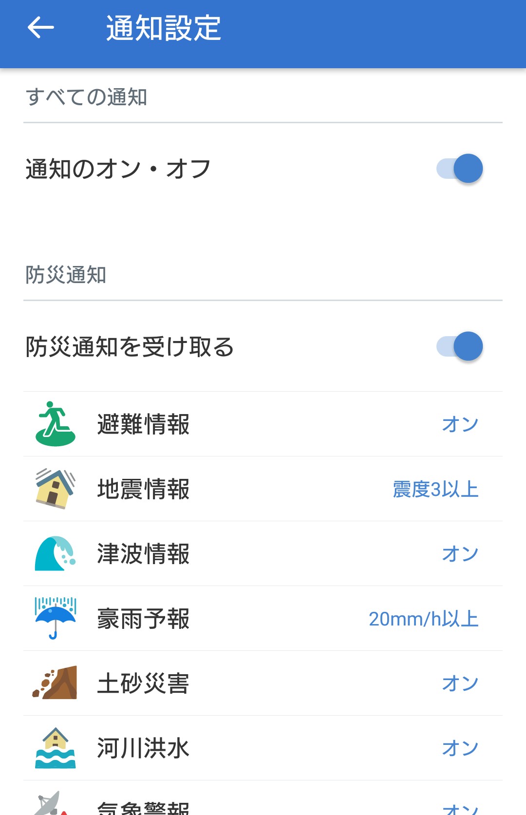 地震速報だけ、豪雨予報だけを知りたいなど、各情報ごとの選択も可能。避難情報、地震情報、津波情報、豪雨情報、土砂災害、河川洪水、気象警報、火山情報、国民保護情報から、必要な情報だけを設定して通知できるので、お住まいの状況に合わせて設定するといいですね。