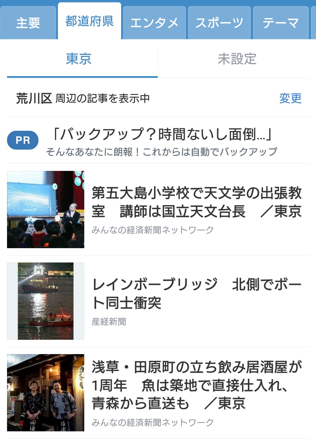 設定した都道府県ごとのニュースを選択して閲覧することができます。47都道府県から2地域まで設定できるようになっています。細かな設定により、テレビニュースなどでは目にすることのない、地域ごとの小さなニュースも目にすることができます。
