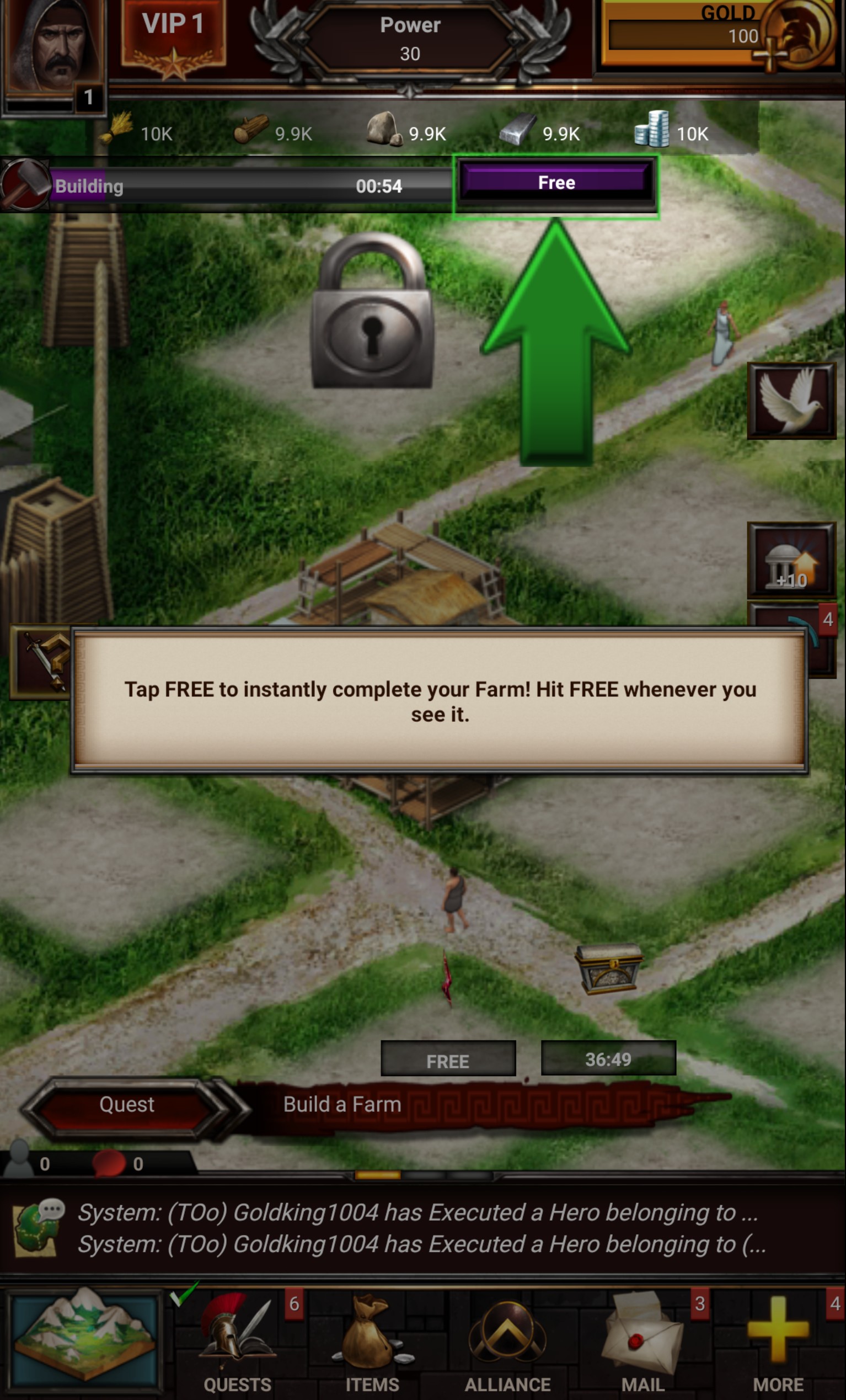 チュートリアルでまずはじめに学べることは自分の拠点となる”王国”に必要な施設を建設しそれをアップグレードすることだ。まずはアテネの指示に従って農場・伐採場・採石場・鉱山などを建設していこう。