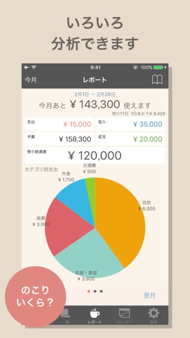 家計簿アプリには欠かせない月のレポートや収支のグラフ化など、さまざまな便利機能が備わっています。