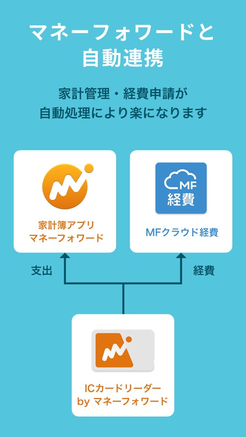 さらに、「ICカードリーダー by マネーフォワード」は家計簿アプリ「マネーフォワード」や「MFクラウド経費」と連携しているため、読みとったICカードのデータをそのまま連携アプリに送ることも可能です。
