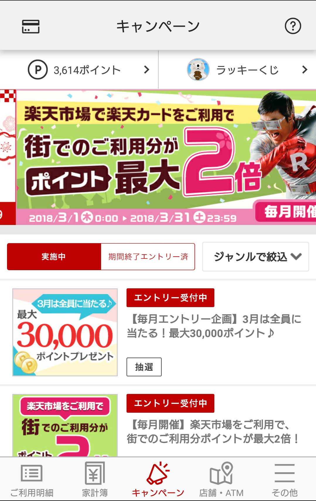 楽天では、オトクなポイントを貰えるキャンペーンを多数行っています。「楽天カード」アプリならば、キャンペーン情報をすぐに確認できるので、ポイントを得られるキャンペーンを見逃さずに参加できます。