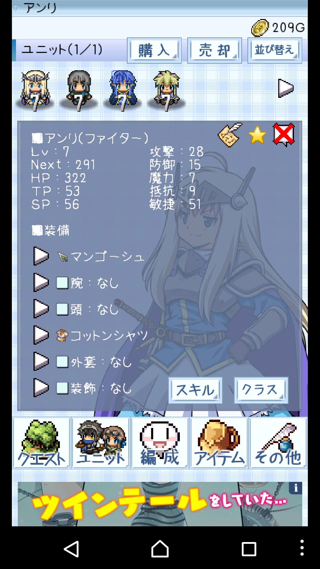 どんどんクエストをクリアして、獲得したお金で装備を買ったり、スキルを覚えたりクラスチェンジしたりしてユニットを育てながら物語を進めていきましょう。