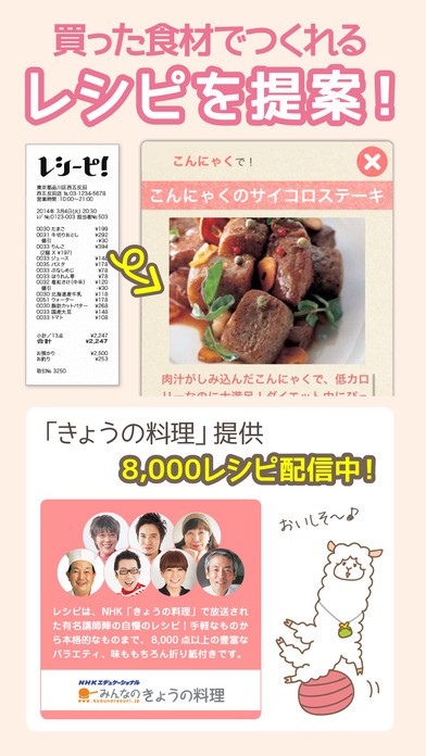「レシーピ!」では、購入した食材をもとに、おすすめのレシピを提案してくれます。レシートから読み取った情報などを参考にして提案してくれるので、家にあるもので作れるレシピが一目で分かります。毎日の献立を考えるのは大変ですが、この機能を活用すれば家事が楽になるでしょう。プロの考えたレシピが見られるので、豊富なレパートリーから飽きることなくレシピを活用できます。