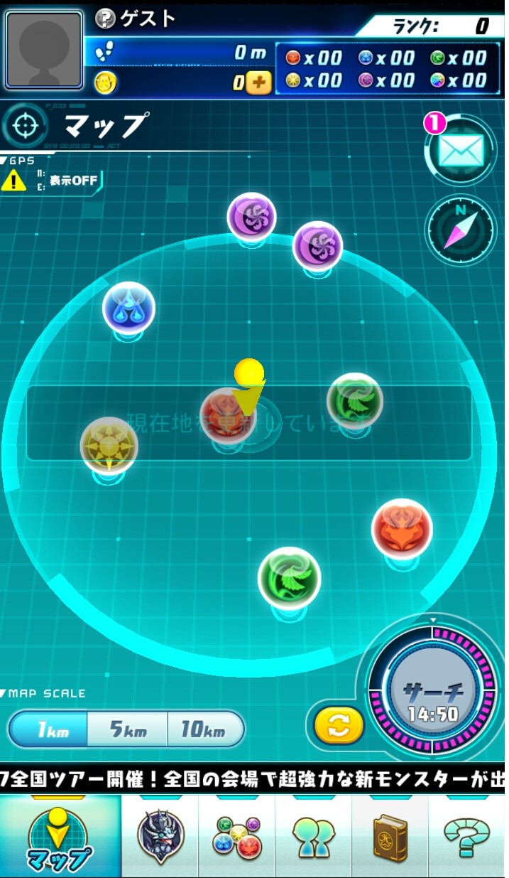 まず、画面左下にあるサーチボタンを押して、現在地の近くにあるドロップやトレジャーをサーチします。