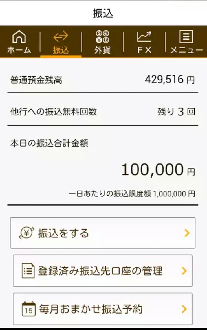振込機能を使うと24時間いつでも振込が行えますし、振込予約もできます。上の画像が振込画面です。通常の振込の他にも、あらかじめ登録した振込先に振り込む機能や、あらかじめ登録した振込先に指定の金額を毎月振り込むこともできます。毎月ATMを利用して振り込みを行っているという方におすすめの機能です。