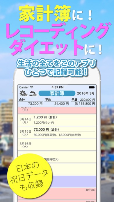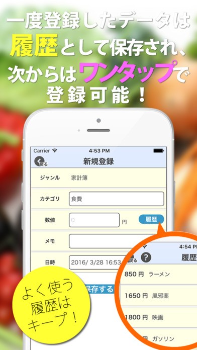 入力する際の手間を極限まで簡略化することで、挫折しがちな家計簿を継続させてくれます。家計簿のデータを複数のカテゴリーにも分けられるので、履歴機能を家計見直しを簡単に行えます。