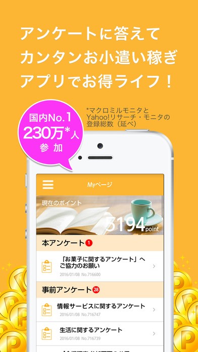 簡単なアンケートから高ポイントがもらえるインタビューまで幅広くそろっているので、いろいろ楽しみながらお小遣いを貯めていけますね。「マクロミルアプリ」を日常的に利用すれば、気づいたときにはかなりの額をゲットできているかもしれませんよ。