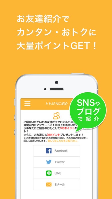 友達を紹介することでもポイントを貯められるので、特にブログやSNSを活用している女性にオススメできるアプリです。「マクロミルアプリ」の良さを宣伝して、いっしょにポイントを貯めていく仲間を作ってみるのもいいですね。