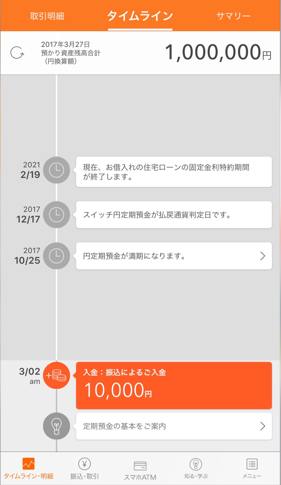 入出金などの取り引きから資産運用まで時系列でお金の動きを確認できるタイムライン表示。SNSのタイムラインのように間にお得情報なんかも一緒に表示される。