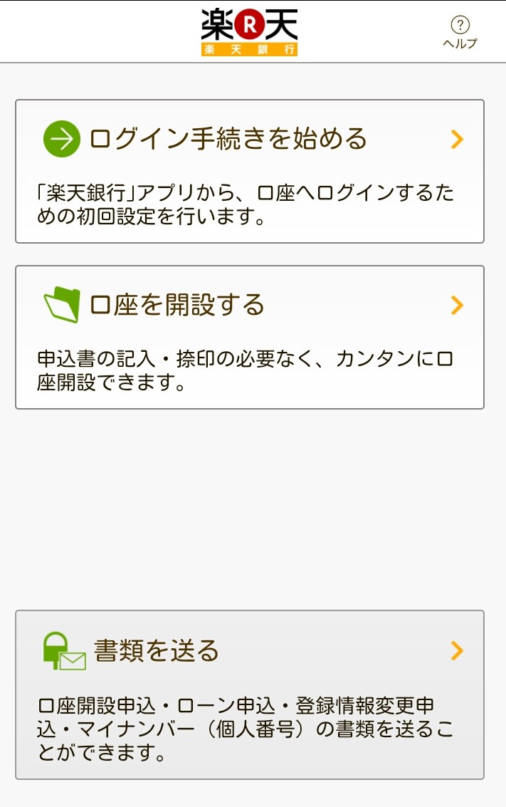 楽天銀行アプリの初期画面からできることは、ログイン手続きと口座開設です。
