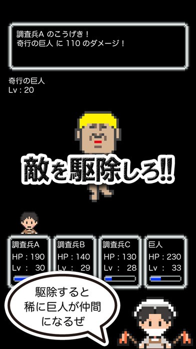 全滅リスクの低いステージを周って戦力を整える方が良いです。また兵団以外にも巨人を倒すとランダムな確率で起き上がり仲間になることがあります。この巨人は一緒に戦ってくれるだけでなく、
