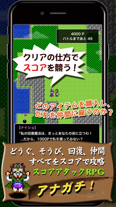 アナガチは昔ながらのドット絵が懐かしいRPGゲームアプリですが、スコアアタックに特化した特徴をもっています。勇者が竜王を倒すべく冒険の旅に出る王道の物語で、最初に4000Pを与えられます。