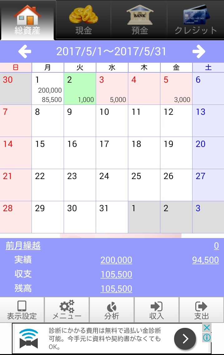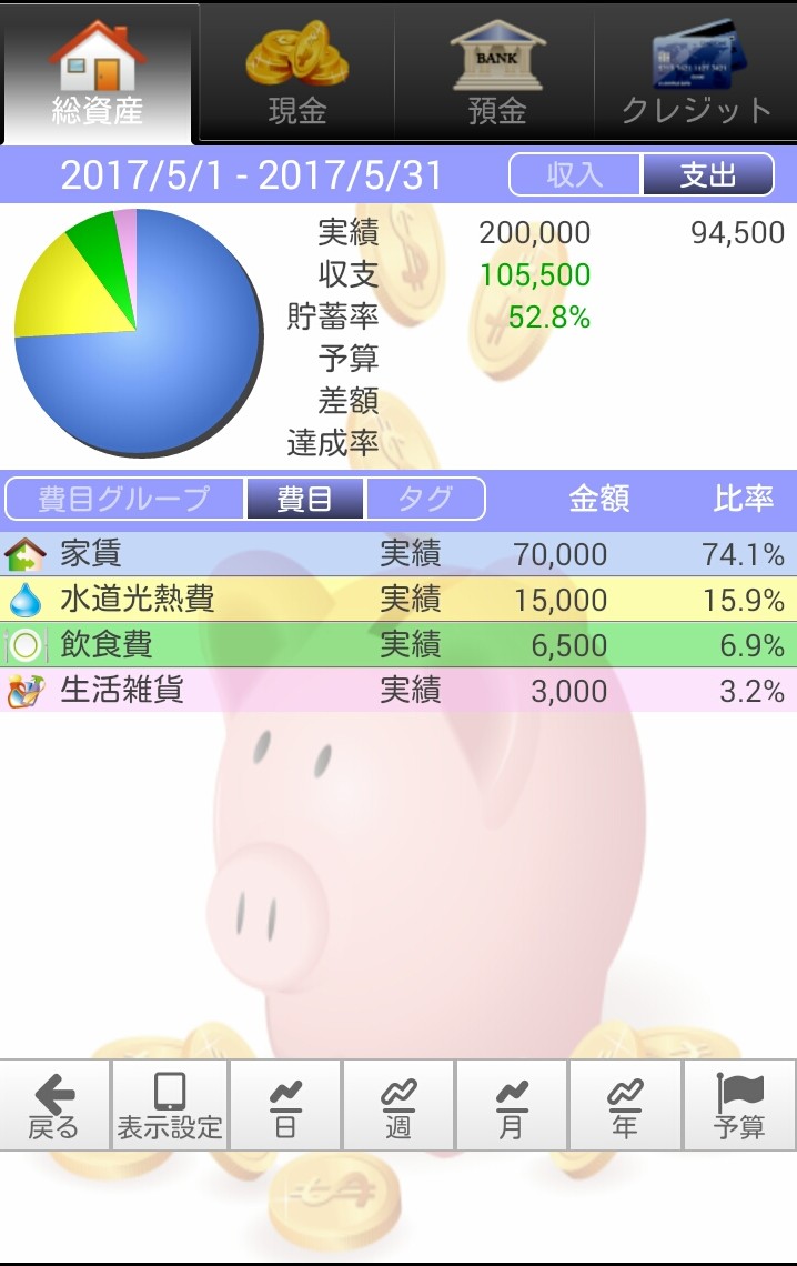 「貯まる家計簿」では、現金、預金、クレジットという資産ごとに収支を管理できます。