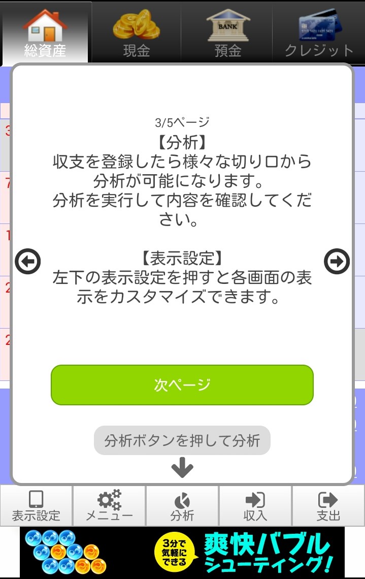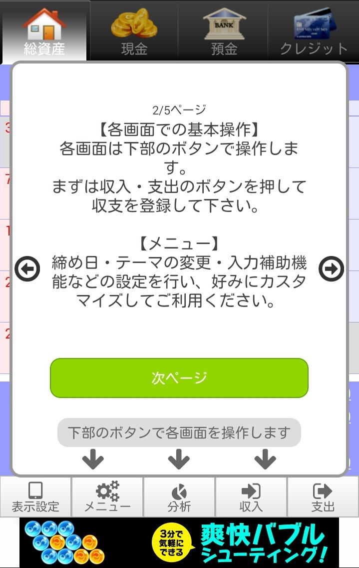 貯まる家計簿アプリの基本操作は、簡単に入力できる記録と分析です。