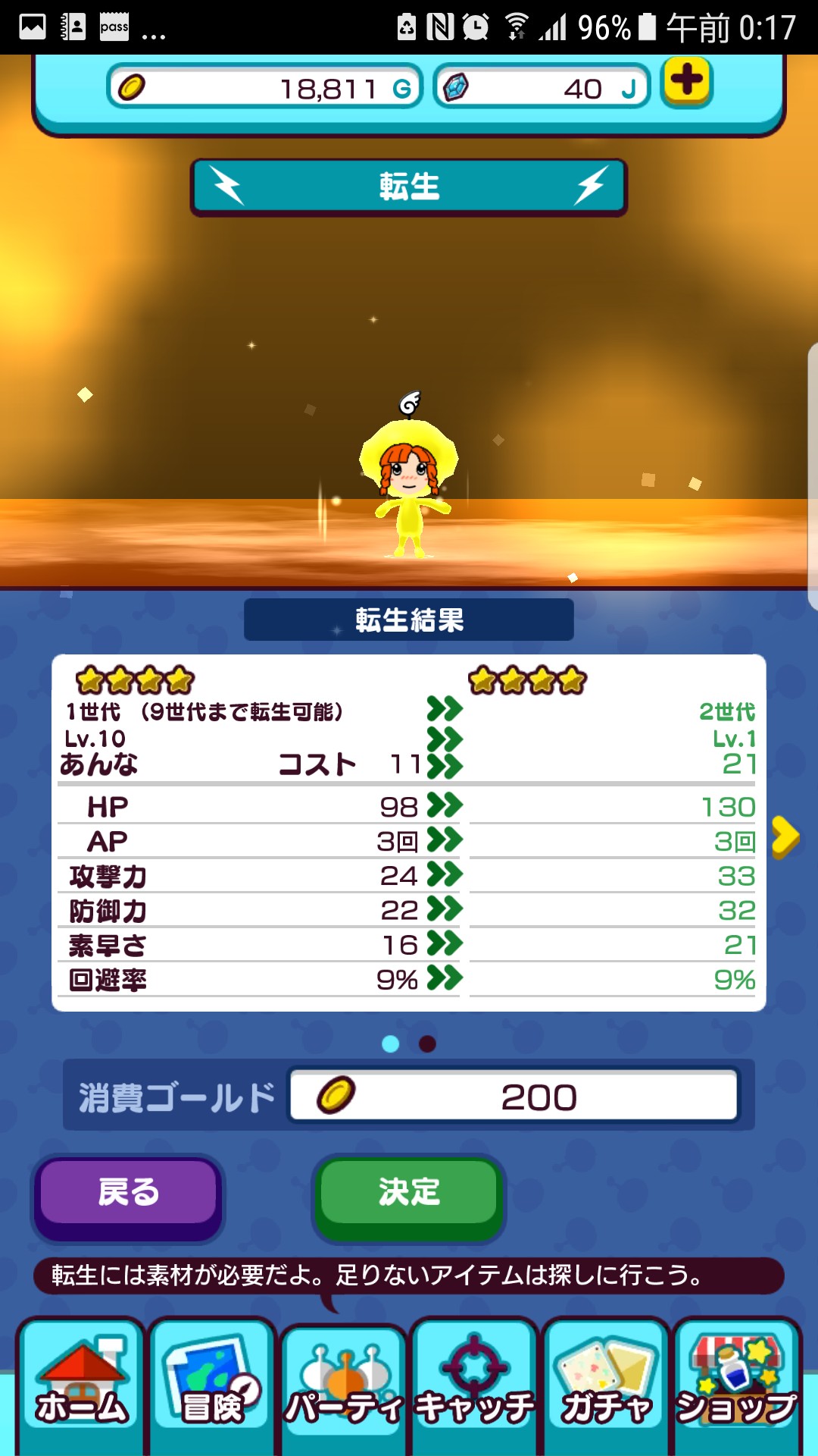 「転生」は素材とゴールドを使って「世代」を一つ上げれます(LV1からになりますが)