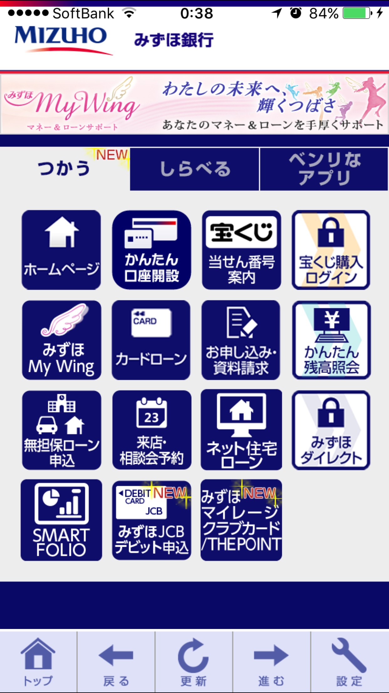 「つかう」タブには各種ローンやデビット申し込みなど、お金を「つかう」ことに関連するコンテンツがまとめられています。