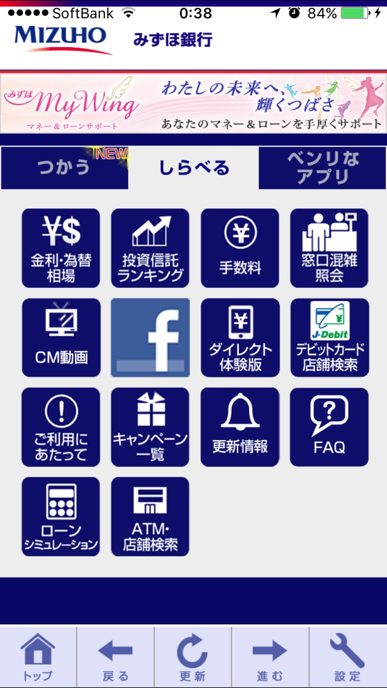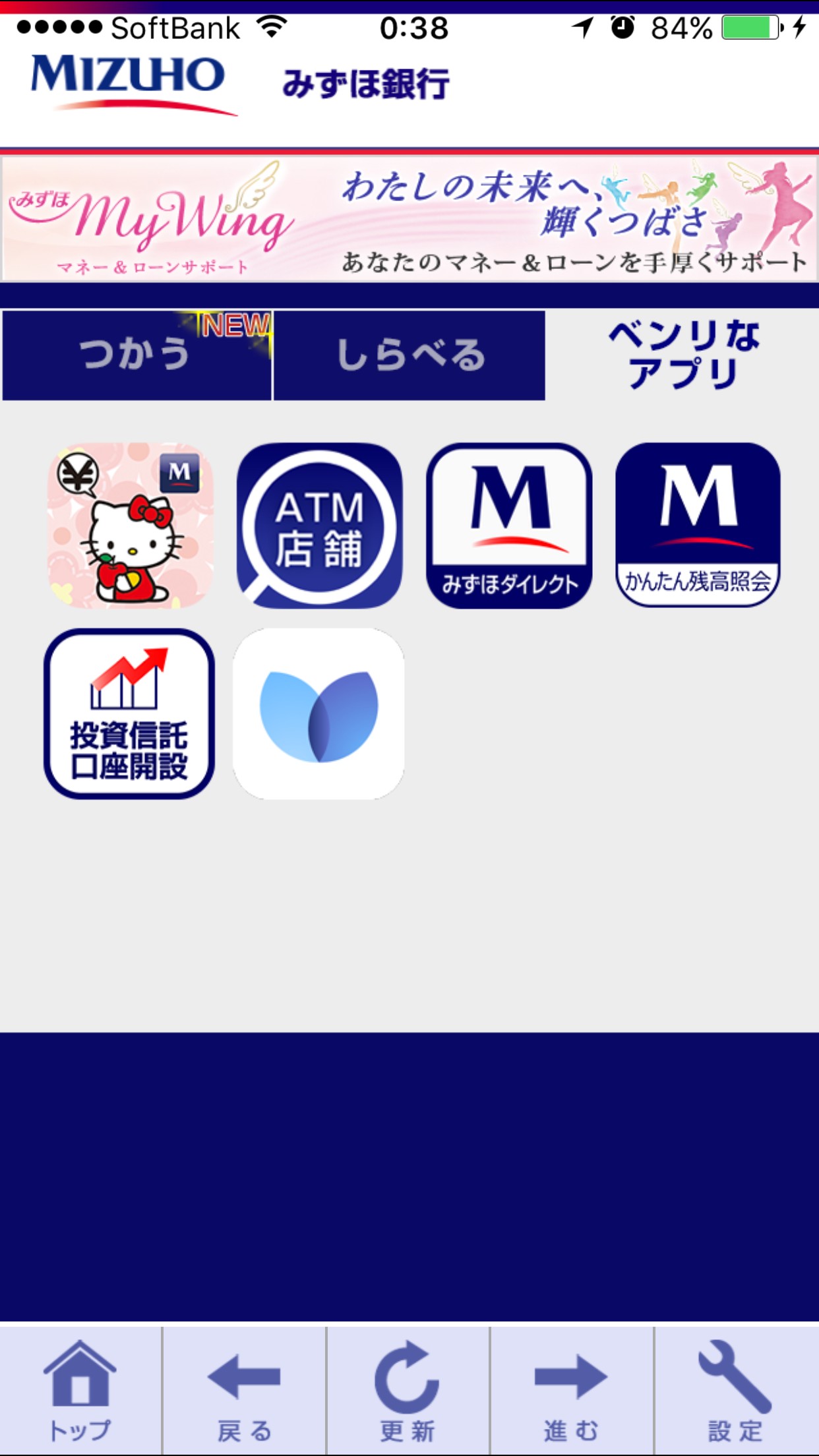 戻る、更新、進むアイコンはそのまま使用できるため、ブラウザでみずほ銀行のホームページを参照する場合と同じ操作が行えます。